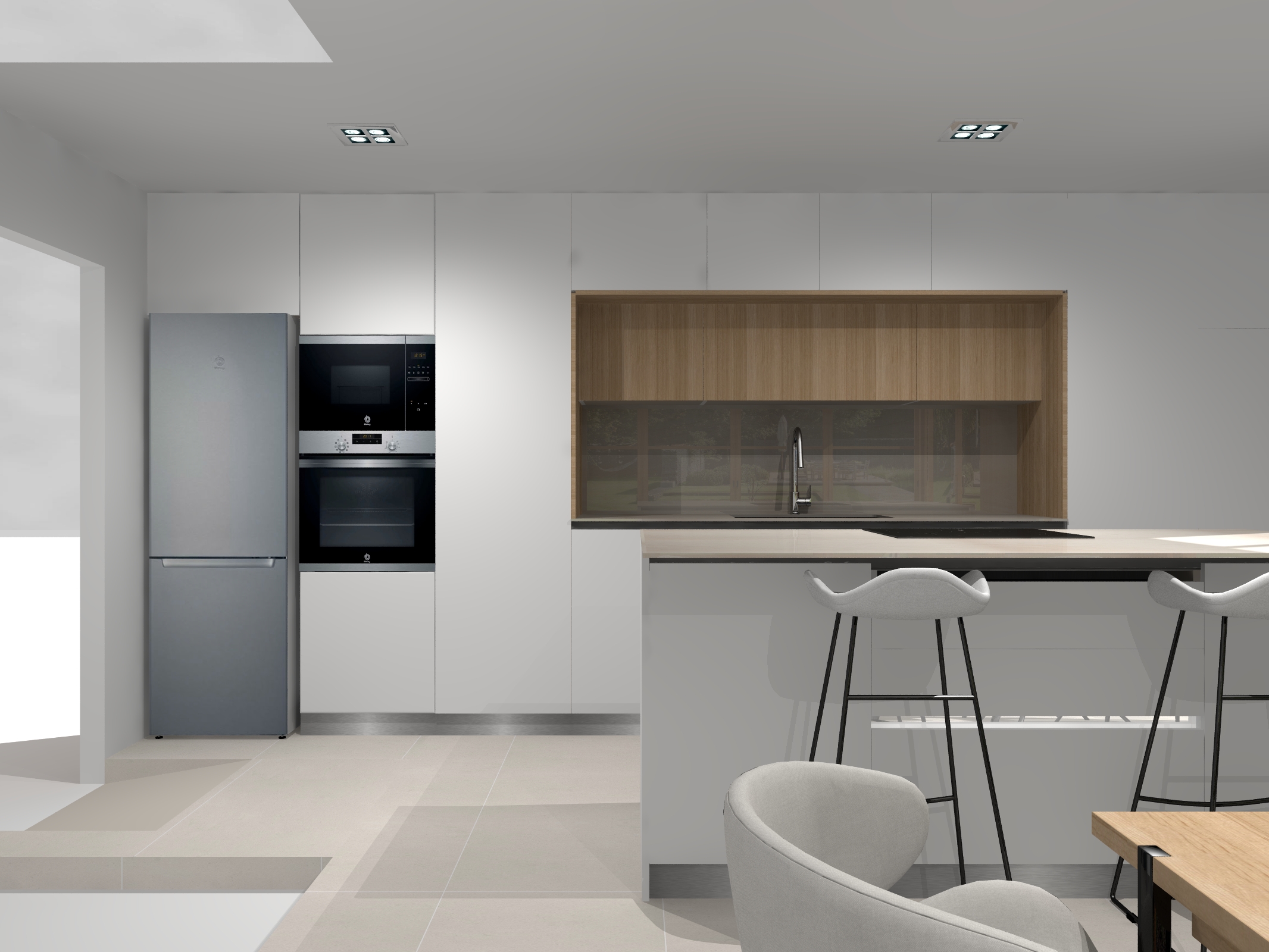 behind the faucet there is a wall made of the same material as the kitchen countertop the material is bottega caliza by xtone