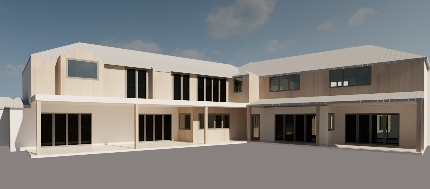 make a photorealistic image the ivory area is smooth beige eggshell stucco and the timber is a light washed white oak wood plank installed vertically the window and door frames are dark anodized bronze and the roof is a silver aluminum standing seam roof make a blue sunny sky with a few clouds give soft shadows for dimension add a grassy backyard and a rectangular pool add four lounge chairs next to the pool add a few scattered mediterranean style plants around the perimeter