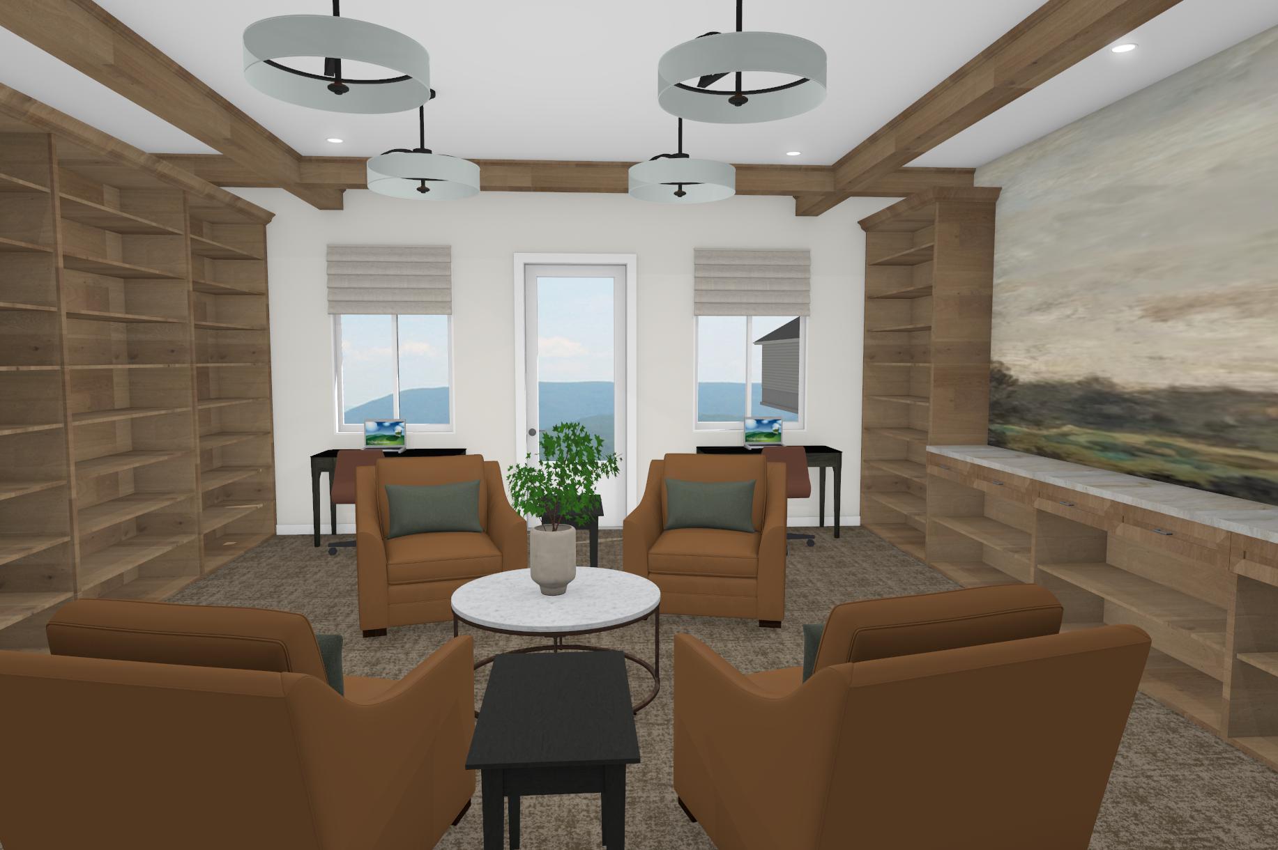 add books to shelving leather chairs green pattern on pillows