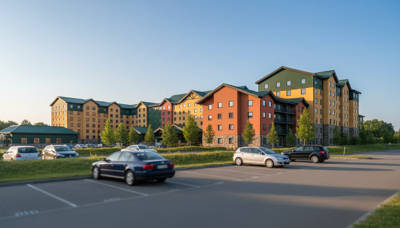 roofs and recessed facade bays to be red oxide plinth to be rough stone as in american lodge photo realistic style add some nice clouds to the sky architecture