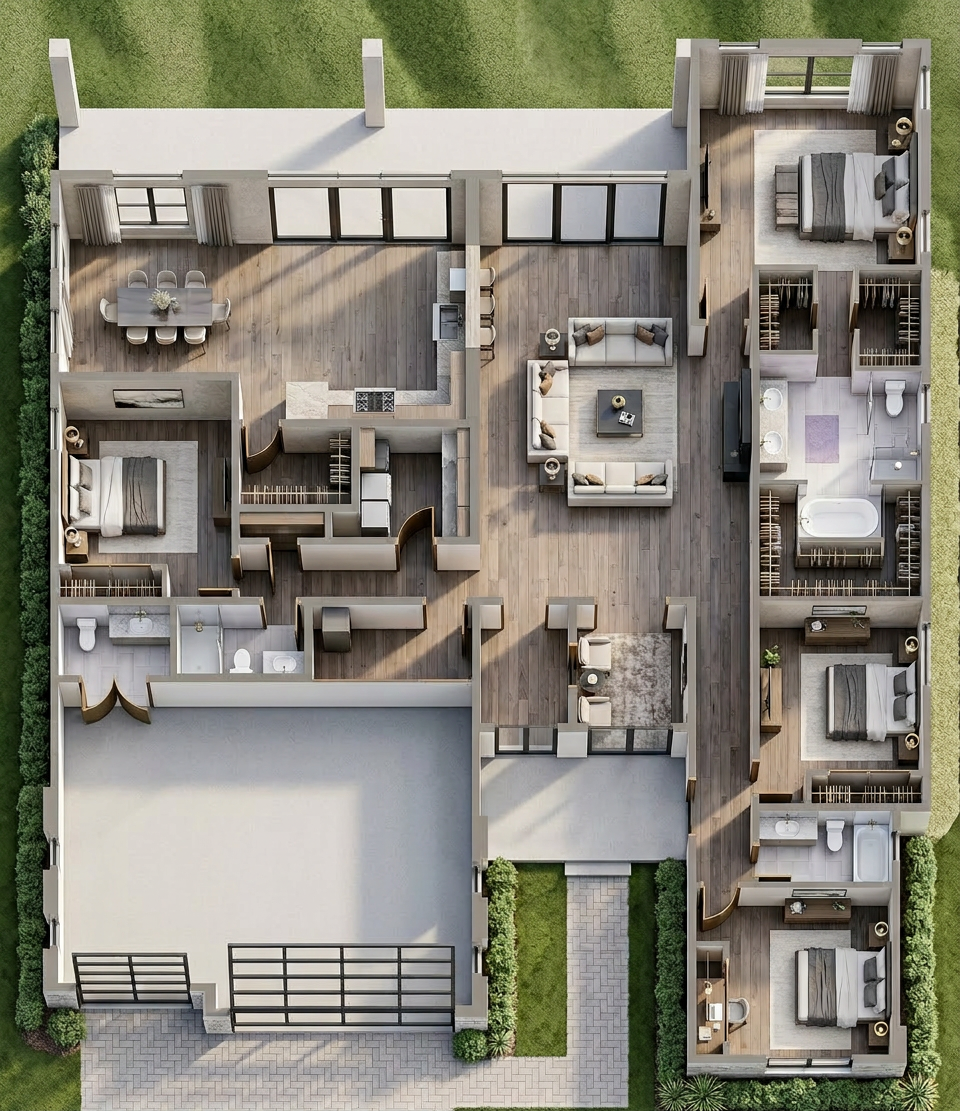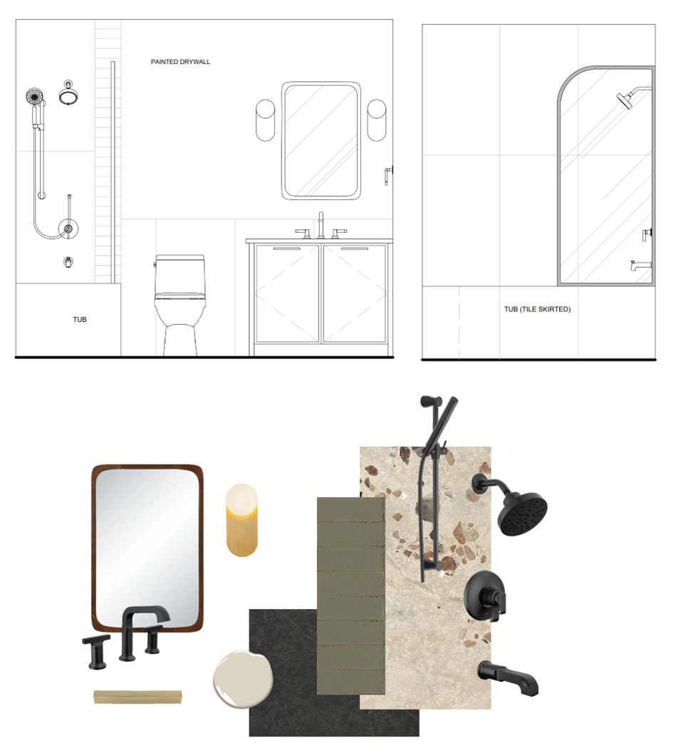 create a 3d elevation of this bathroom the cabinets are a light off white the countertops are dark the floor and wall tile is 12 x 24 and has a natural aggregate