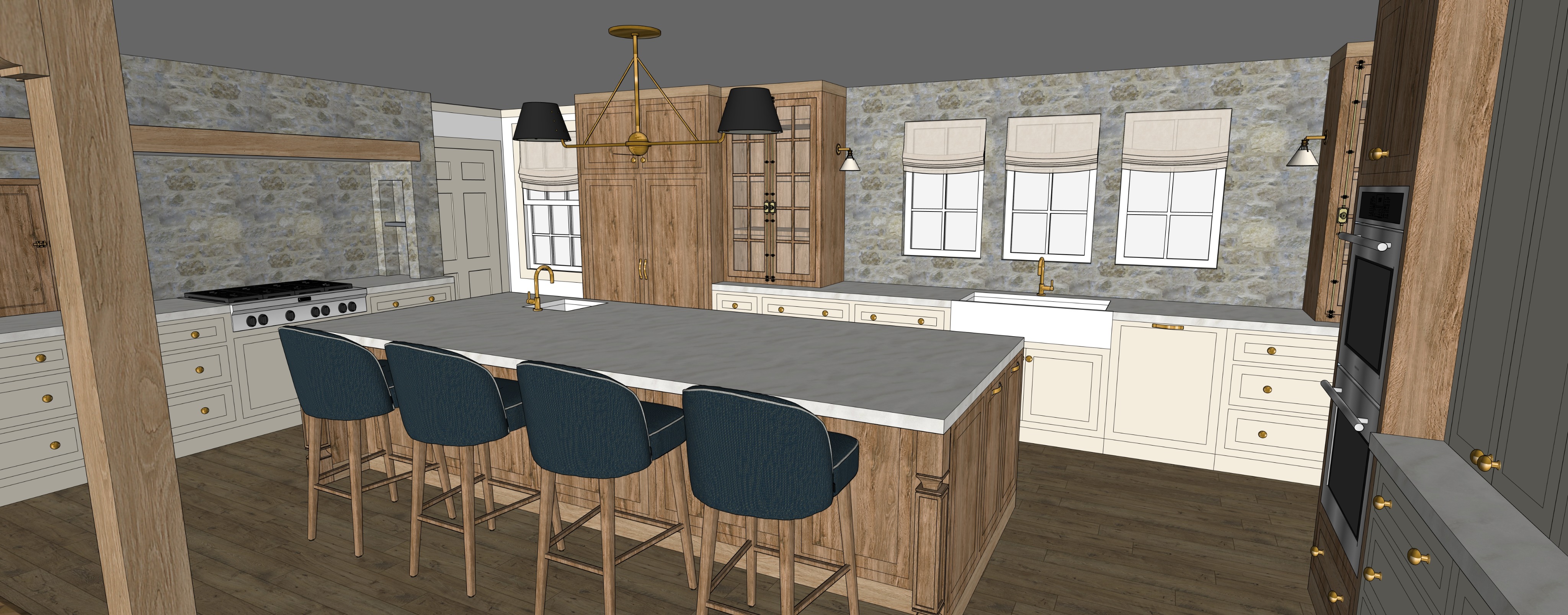 create a highly photorealistic rendering of a traditional kitchen using the provided image as a fixed architectural model maintain all geometry exactly as shown island size and placement cabinetry layout range wall windows lighting fixtures and camera perspective must not change this is a final finishes rendering intended to feel like a professionally photographed interior overall mood warm refined and softly moody balanced contrast not flat not dramatic natural timeless and material driven materials wood primary fix warm natural oak with clear grain variation and tonal depth slight aging and softness avoid raw or orange tones matte finish columns slightly deeper richer than island add shadowing at joints seams and leg transitions current issue still reading too uniform and light perimeter cabinetry soft off white warm beige matte finish slight variation panel to panel deepen shadows in door profiles drawer reveals island same wood family but slightly richer tone add shadow under overhang darker tone at base subtle wear at edges countertops honed marble soft gray with warm undertones subtle veining low contrast matte finish no shine stone walls critical correction limestone look tones warm gray beige soft taupe reduce contrast by 30 40 blend transitions between stones add soft shadow in joints slight surface irregularity must feel quiet and tonal not busy or patchy range wall same stone tone control keep visual calm no focal contrast spikes hardware fixtures aged brass muted soft patina no bright reflections barstools deep blue green upholstery matte woven texture visible but subtle slight variation between stools wood legs warm and natural lighting final pass most important natural light soft daylight from windows diffused and even slight brightness near windows fading into room interior lighting pendants very soft glow only no visible hotspots shades remain mostly dark sconces soft warm accent light no bright halos shadow grounding fixes critical add stronger contact shadows island legs to floor stool legs to floor toe kicks add shadow under island overhang slight darkening under stools soft gradient across floor plane this eliminates any floating effect depth contrast slightly darken foreground columns island edge keep midground island stools balanced slight lift at window wall creates natural depth and hierarchy color temperature 3000 3500k warm neutral balanced no yellow cast realism boosters ambient occlusion at cabinet seams floor junctions under hardware micro variation wood tone shifts slight paint inconsistency subtle imperfections slight desaturation 5 10 for realism camera output maintain current wide perspective eye level 5 ft 28 35mm lens high dynamic range 4k 8k resolution rendering style editorial interior photography soft contrast not flat materials feel tactile and real no glossy or artificial surfaces