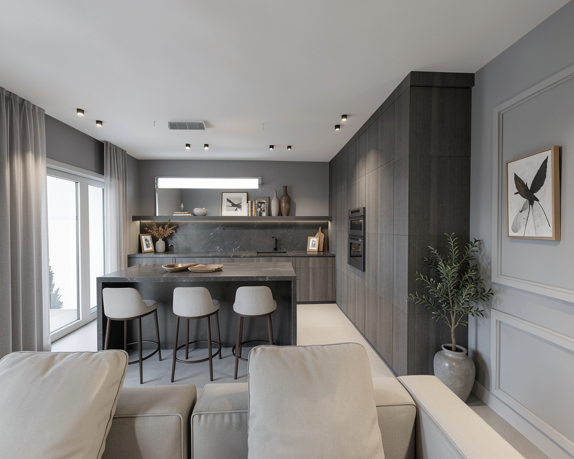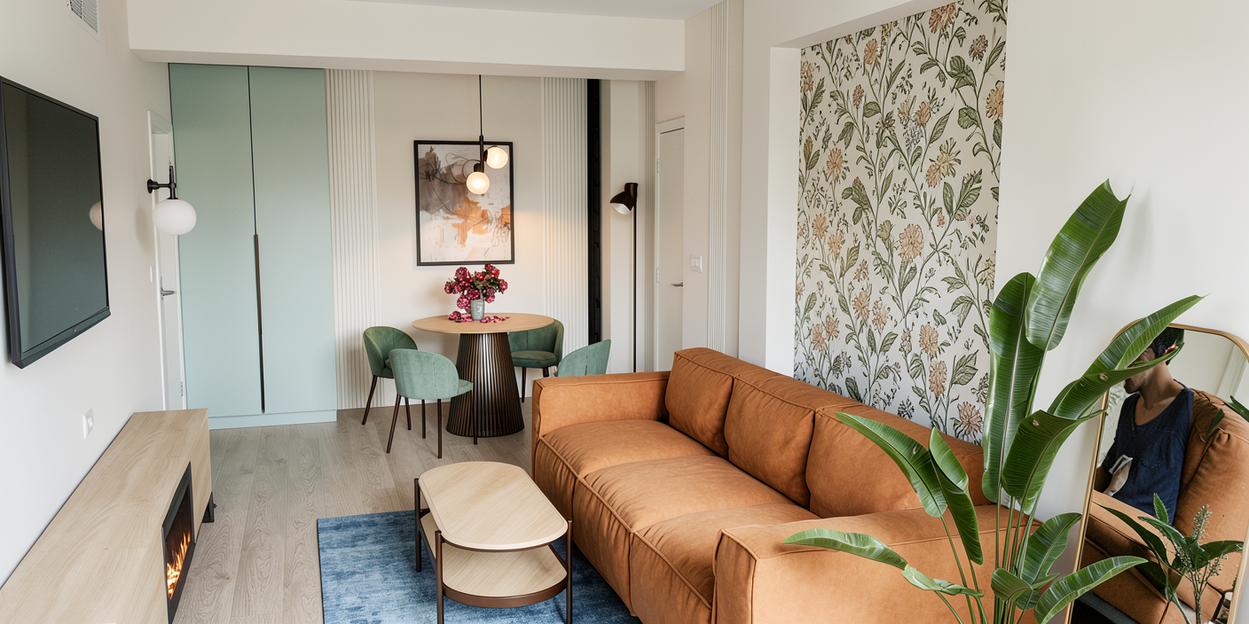 masa e janette de la kave home din lemn complet in dreapta mesei e o oglinda de jos pana sus cu rame metalice in spatele canapelei avem tapet modelul e asta https rebelwalls com ro grow green peretii sunt offwhite gri deschis dulapul este hex cdd4cb