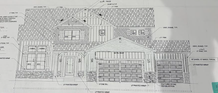 slightly off white siding slightly of white fascia and soffit slightly off white house trim black standing seam metal roof over large garage door stained front door overgrouted masonry with cream and brown stones white windows warm medium brown shutters warm medium brown garage doors with black hardware
