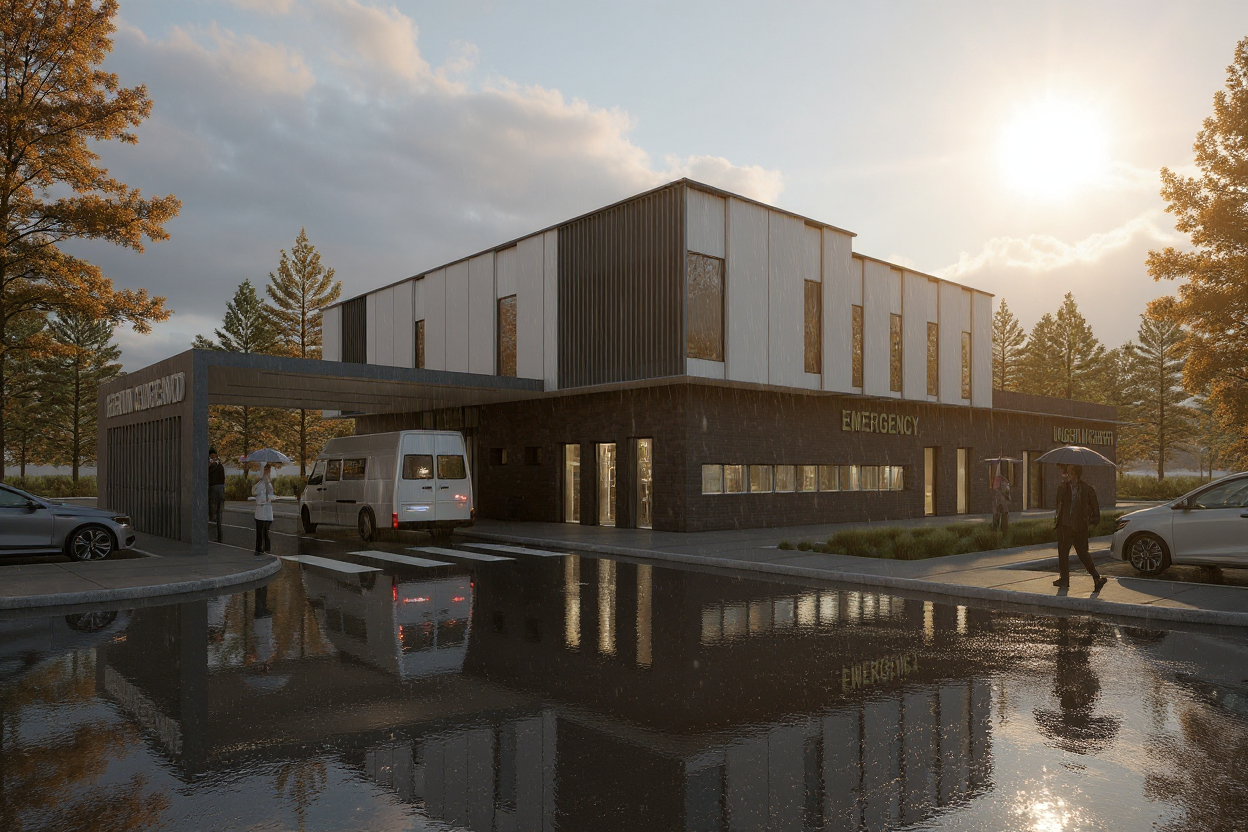 the picture shows a new emergency station and a bright autumn rainy day the sun is slightly shining through the clouds in front of the building under the canopy are two young female doctors people are walking with open umbrellas the emergency vehicle has its emergency lights on in the wet areas in front of the building you can see reflections of the sky and nature and the building behind the building is an autumn colored forest the light of the picture is slightly cold it is a little raining the vehicles have their lights on under the canopy is a white van with the markings of the emergency vehicle