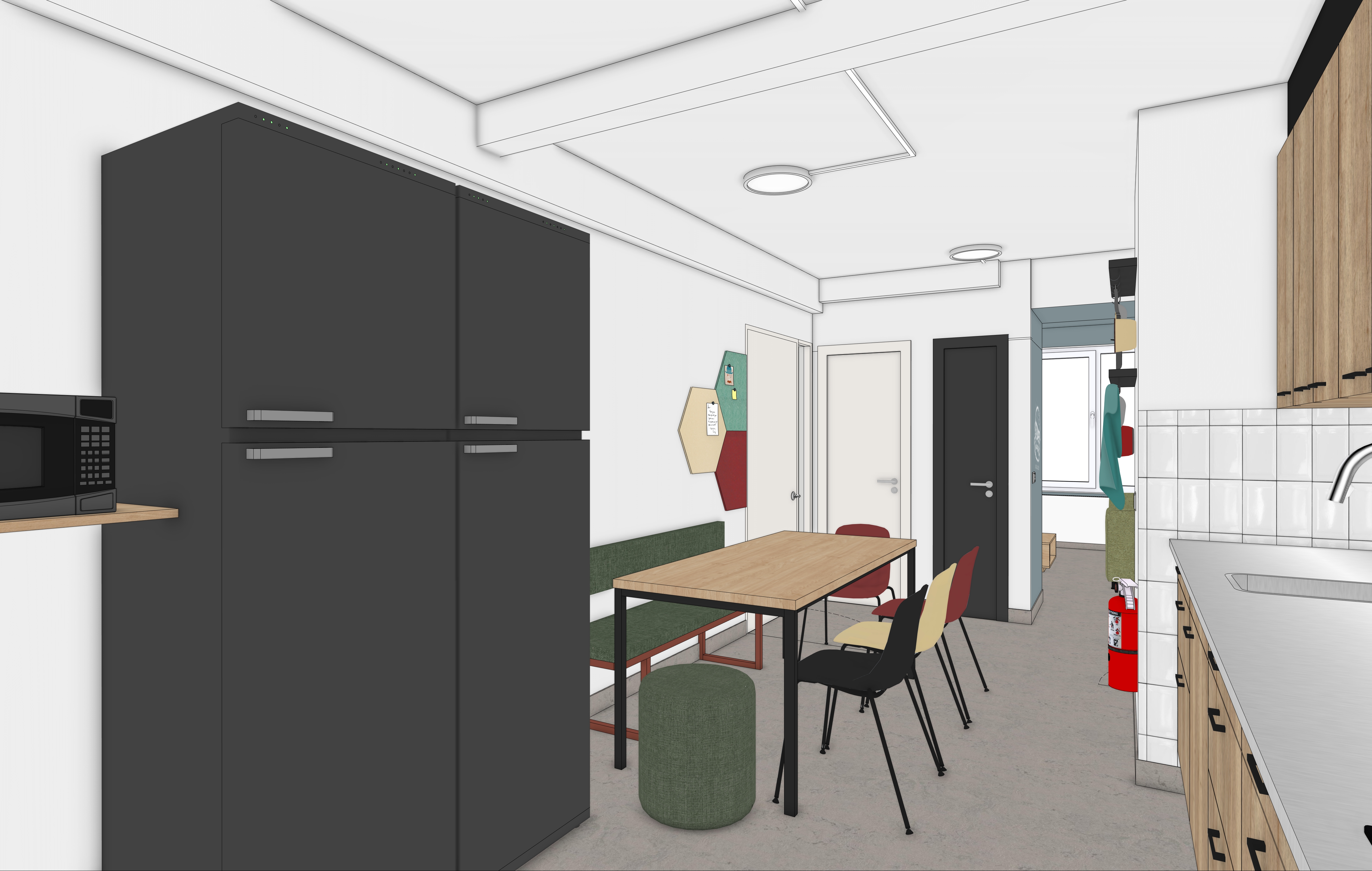 maintain all colors natural daylight also a window behind us small city skyline wageningen beige chairs are ral 1001 the red chair is ral 3005 turn the black chair is ral 9004 turn the lights on the hexagons are felt table top is h3170 from egger