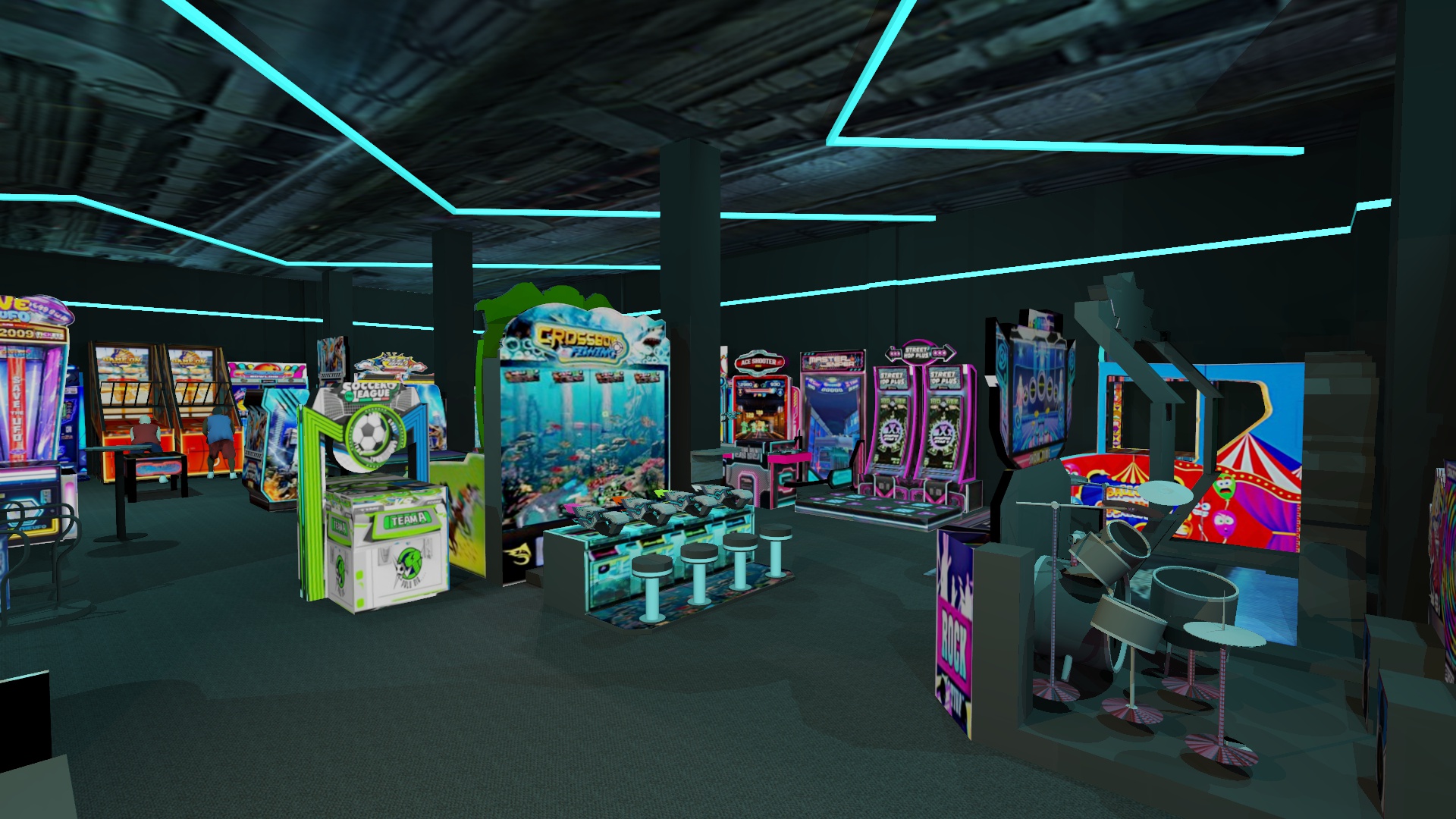 an arcade and gaming hall the machines glow brightly black walls and a black ceiling the floor covered in dark gray carpet turquoise light lines on the ceiling and turquoise lighting under the furniture create a photorealistic effect