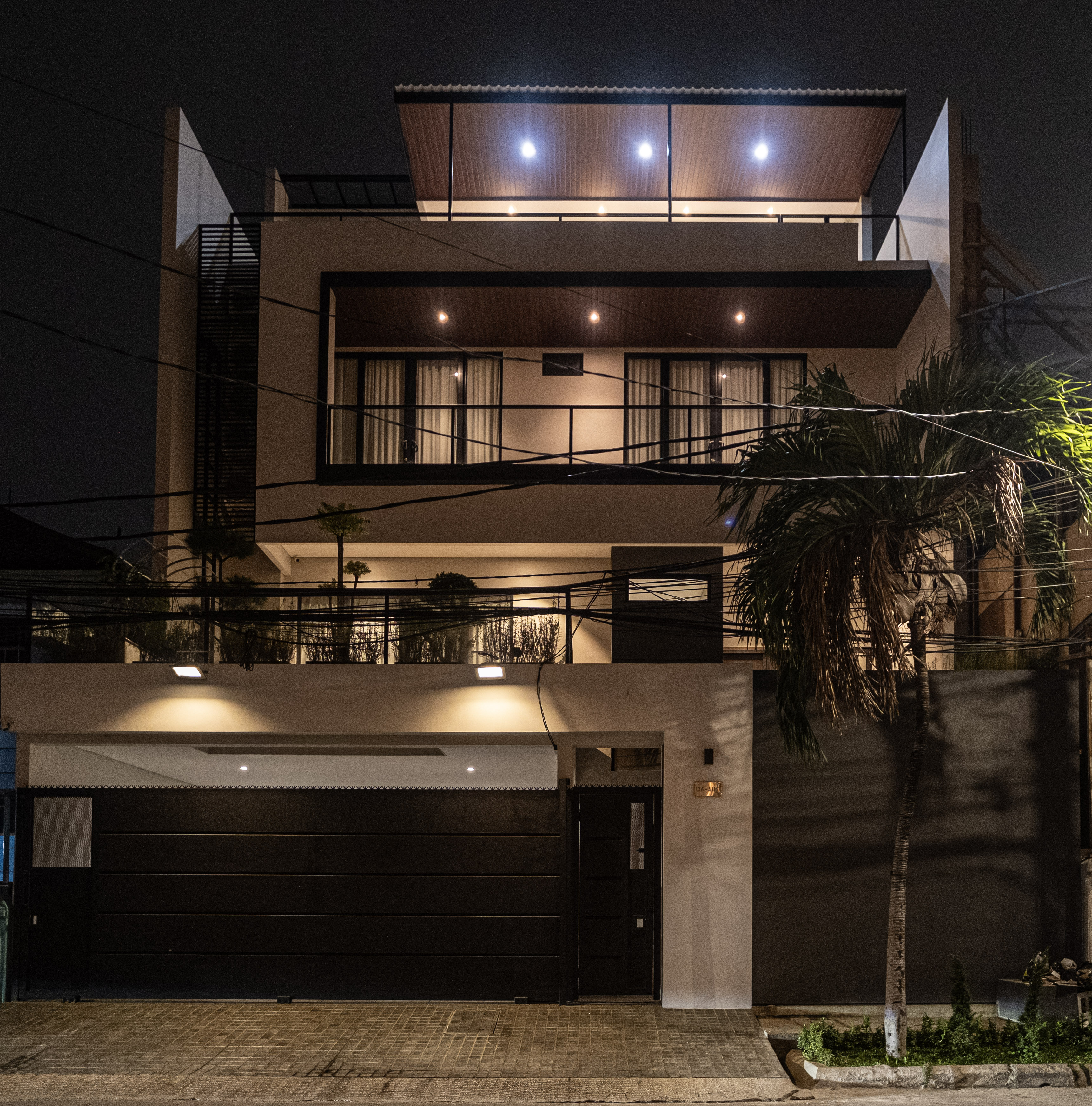 warm light on the night view make the image slightly brighter as if its in the evening time erase the unwanted cabling in front of the house make an ultrarealistic photo for this image put slightly clouds or stars on top not too much just few change the white light at the third floor into warm 3000k light color