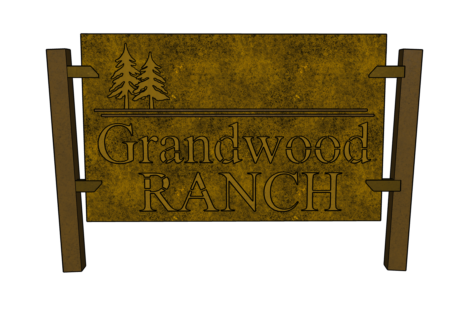 photorealistic rendering of a custom entry sign placed at the exact location of a small rock on a gently sloping grassy corner lot beside a paved rural road in a colorado mountain setting the background includes open meadow scattered pine trees and a few distant homes under a bright blue sky with light clouds replace the small rock with a freestanding sign structure the sign is made of weathered corten steel with a rich rust patina it is mounted between two simple vertical steel posts with horizontal bracket arms matching the reference design proportions the main panel is a rectangular corten steel plate the words greenwood ranch are cut out as negative space through the face of the panel behind the cut letters is a second corten steel backplate set off the main panel to create depth soft warm led lighting is integrated at the bottom of the sign shining upward between the front panel and backplate causing the cut out letters to glow subtly and emphasizing the depth of the negative space above the text two pine tree silhouettes and horizontal line elements are not cut out but instead are positive pieces mounted proud of the surface about 1 2 inch casting small shadows and adding layered dimension material detail should show natural corten variation slight edge darkening and realistic weathering lighting should feel natural to the environment with additional subtle glow from the integrated leds camera angle should match a roadside perspective slightly angled toward the sign showing depth context and how it sits in the landscape keep scale realistic and grounded with the sign feeling permanent and well integrated into the site