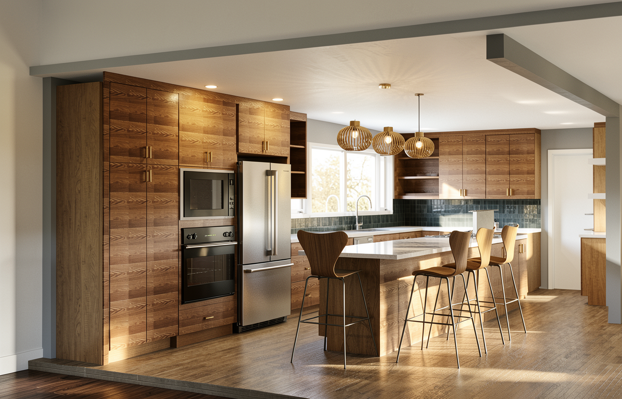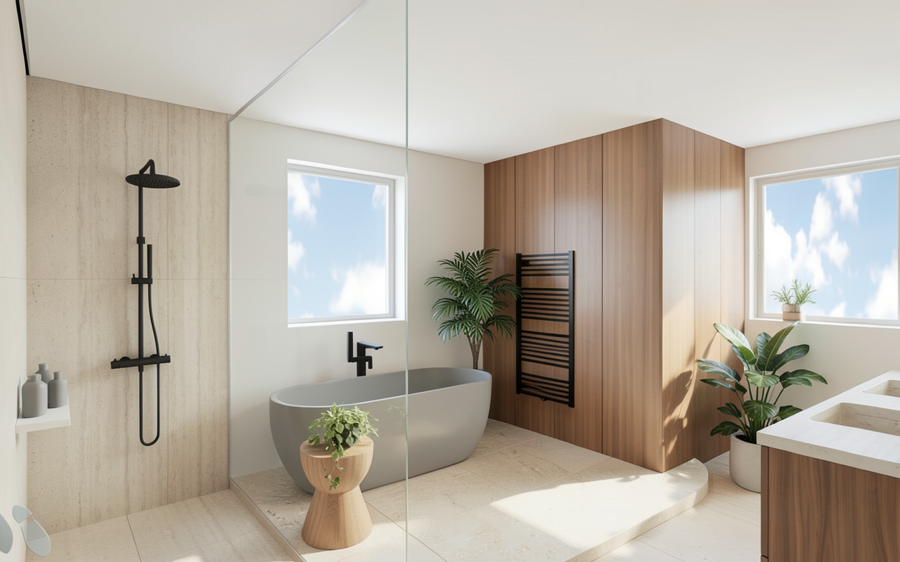 modern minimalist bathroom interior with a calming serene atmosphere featuring a light beige stone tiled floor and walls a sleek matte black shower fixture and smooth white walls the freestanding bathtub is a soft white complementing a rich wallnut wood storage unit large windows display a bright blue sky with fluffy white clouds allowing natural light to flood the space a simple wooden stool with lush green plants adds a touch of nature the overall palette integrates soft whites gentle beiges warm woods and calming off whites creating a spa like oasis