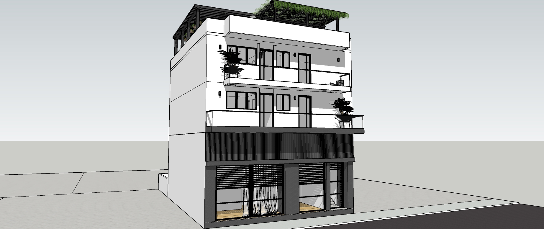 modern minimalist multi story building with lush rooftop garden bright midday sunlight vibrant green plants on top sleek glass windows smooth white exterior walls contrasting black balcony railings and trim light wooden floor inside ground floor clean urban street setting clear blue sky peaceful and contemporary atmosphere