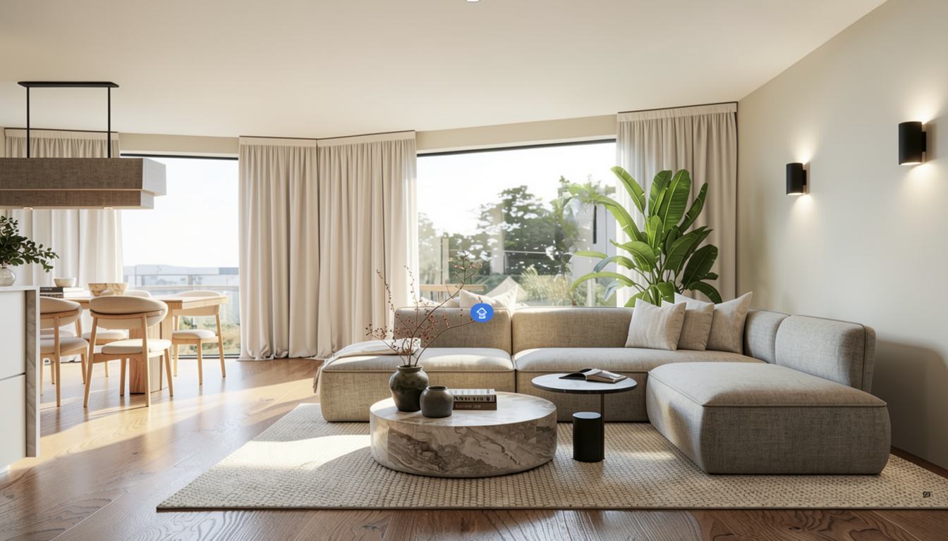 generate a modern kitchen interior scene with a warm and inviting atmosphere use earthy light brown for the wooden cabinets adding a touch of natural texture contrast with soft sage green for the shelves and additional cabinetry infusing a calming vibe the countertops should be a pristine white enhancing cleanliness and brightness incorporate a sleek black for the sink faucet and stovetop providing modern elements add a large window view with lush green trees and a hint of red foliage outside suggesting a vibrant lively garden the overall atmosphere should feel cozy and intimate while elegantly modern