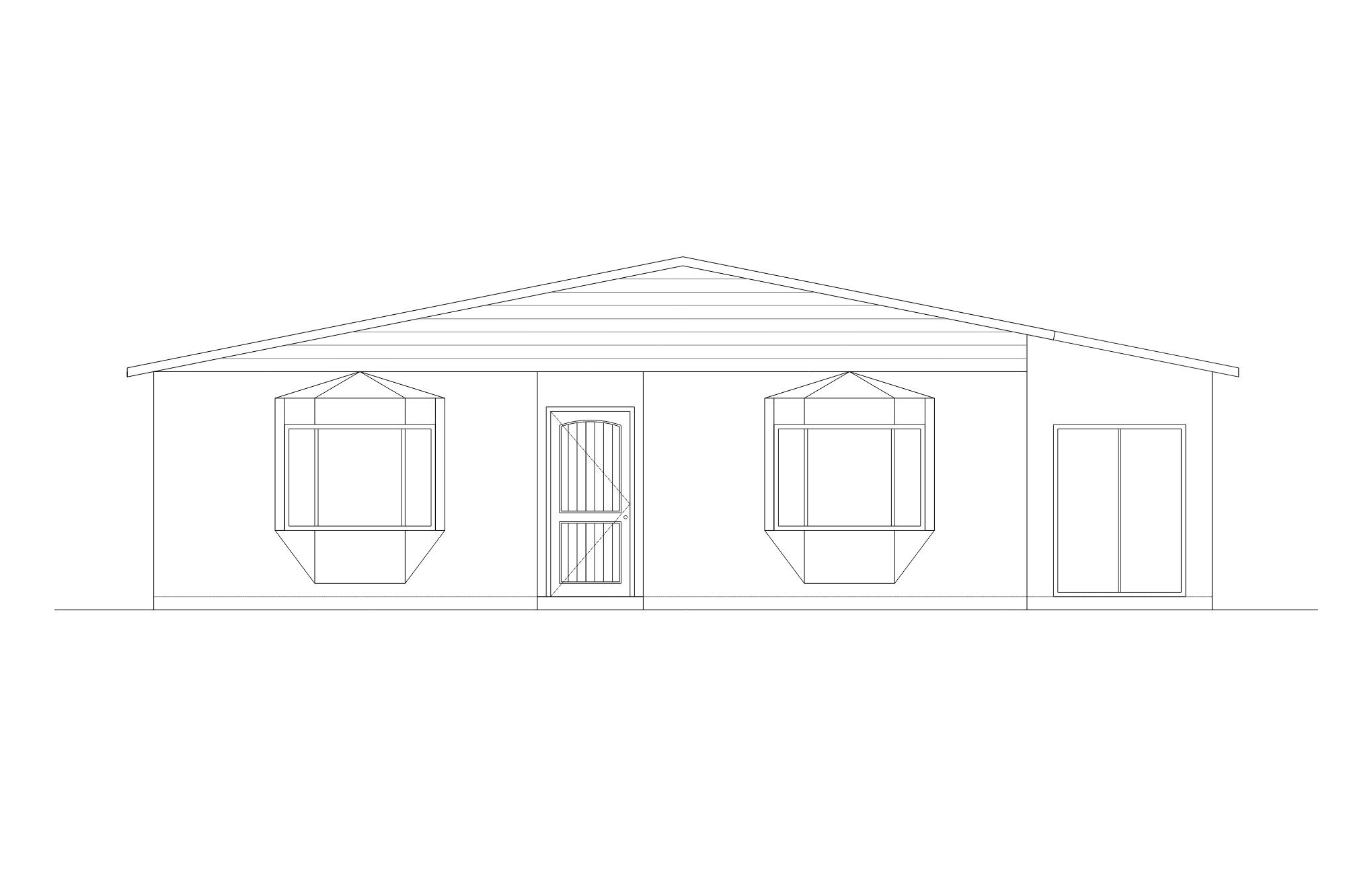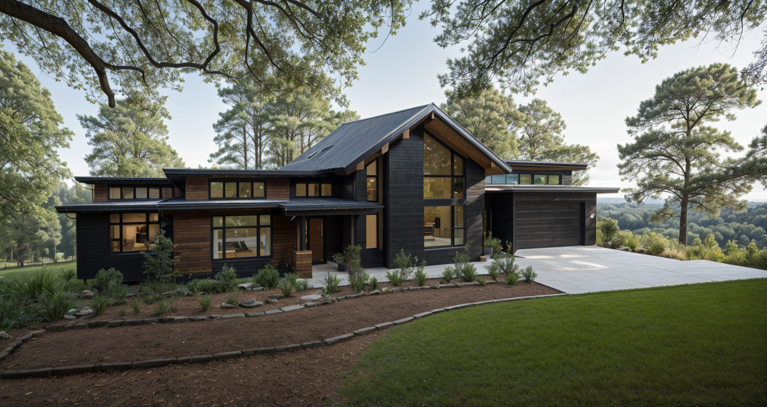 tudor revival exterior shot render a modern single story house with a triangular roof and large bay windows the exterior walls are painted in a soft pastel blue providing a tranquil and inviting appearance the roof has a crisp white finish adding a touch of elegance the windows are framed with dark grey trim for a sleek and modern contrast the front door is painted in a warm welcoming mahogany brown set the scene during a sunny day with a clear blue sky and soft fluffy white clouds include green manicured lawns and vibrant flower beds with reds yellows and purples around the house the atmosphere is peaceful and serene reflecting a perfect suburban afternoon with bay windows architecture