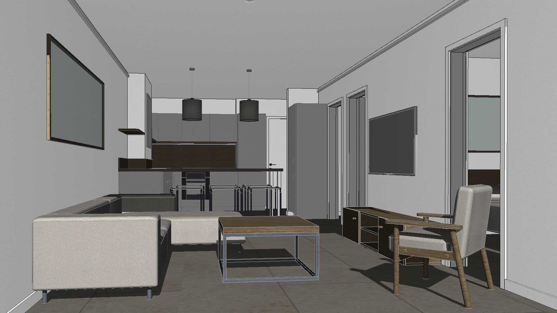 appartement st tropez le sol est en carrelage taille 80x80 teinte pierre beige les murs sont blancs esprit cosy boheme le bois des meubles est en chene la cuisine est blanc laqu et le plan de travail est en chene clair il y a grand tableau contemporain aux teintes claires derriere le canap il y a une tv devant le canap la porte derri re le fauteuil donne acc s a une chambre remplacer les suspensions par omaja suspension en verre ambr et m tal dor mettre une plante sur tag re cuisine cot des suspensions tapis en jute sous canap mettre des coussins sur canap et des magazines et verres de ros sur la table basse