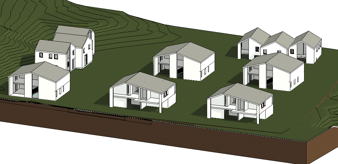 modern hillside village with rows of contemporary houses the homes feature sleek white exteriors with dark gray roofs behind the houses a lush hillside stretches across the scene in rich green tones evoking a sense of tranquility the foreground is a warm earth brown representing the rich soil of the area the atmosphere is serene and peaceful with soft natural lighting that enhances the harmonious blend of colors