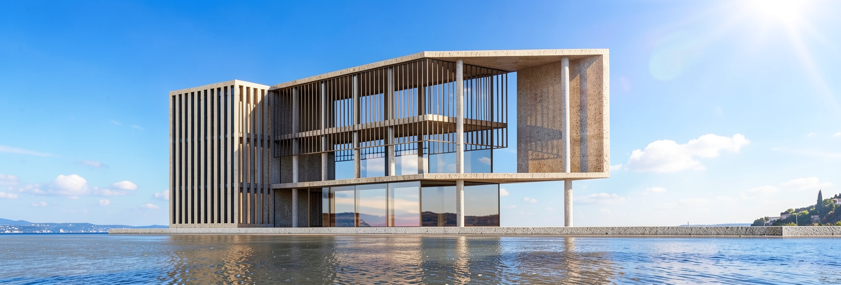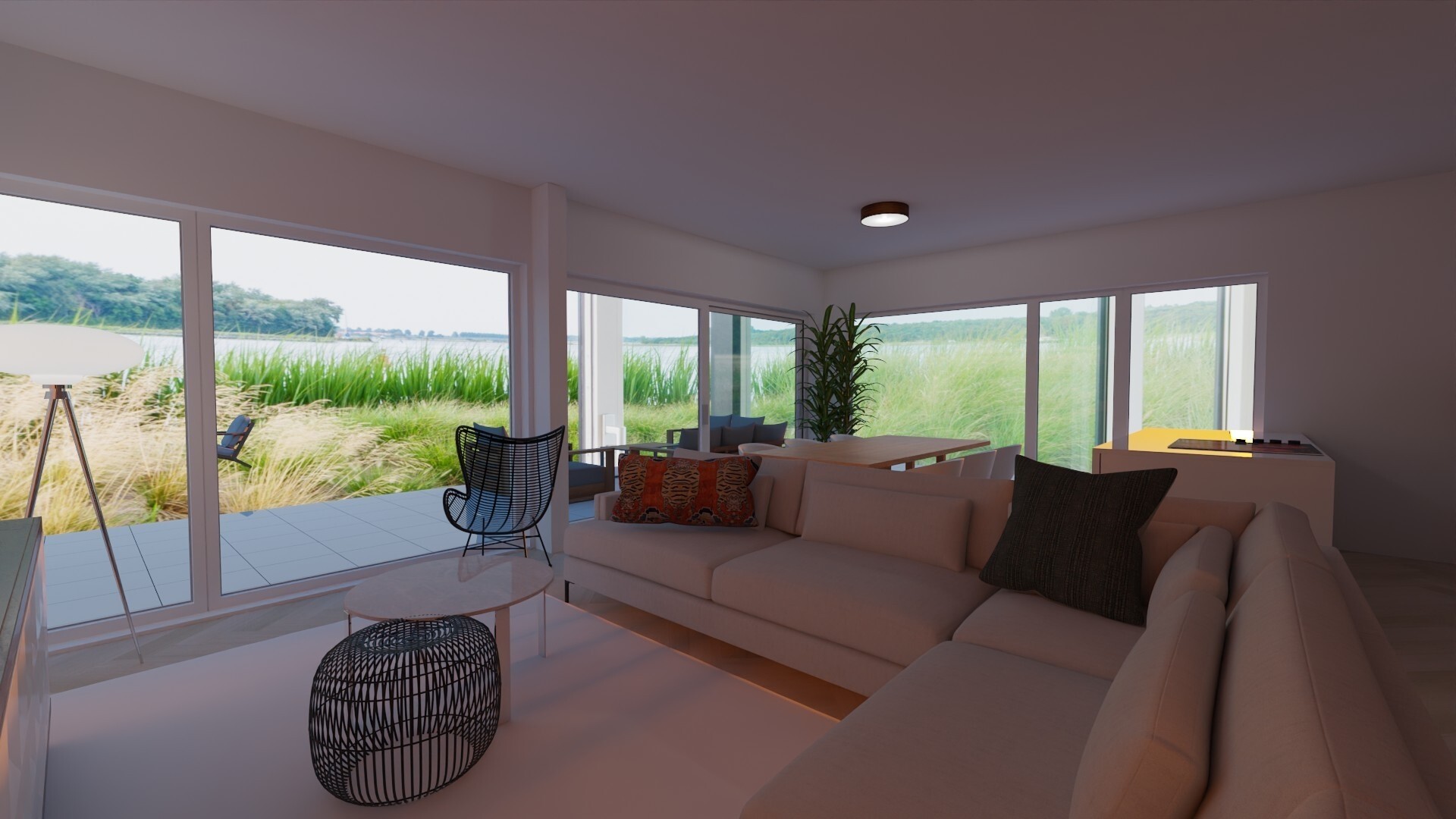 make realistic high end interior looking rendering without changing the architecture layout kitchen block or camera position important the kitchen block on the right must remain exactly as it is do not move or redesign the kitchen keep all windows walls and perspective unchanged style modern beach soft minimal natural luxury materials light oak wood natural finish soft fabrics linen boucle look matte finishes only color palette beige sand off white light taupe no strong contrast or dark dominant elements styling minimal and refined ceramic vase with dried grasses on dining table subtle decorative objects on coffee table lighting soft natural daylight from the windows warm airy atmosphere environment integration ensure correct scale and realistic spacing keep sightlines open towards the water view mood calm elegant high end living emphasis on space light and connection to outdoors
