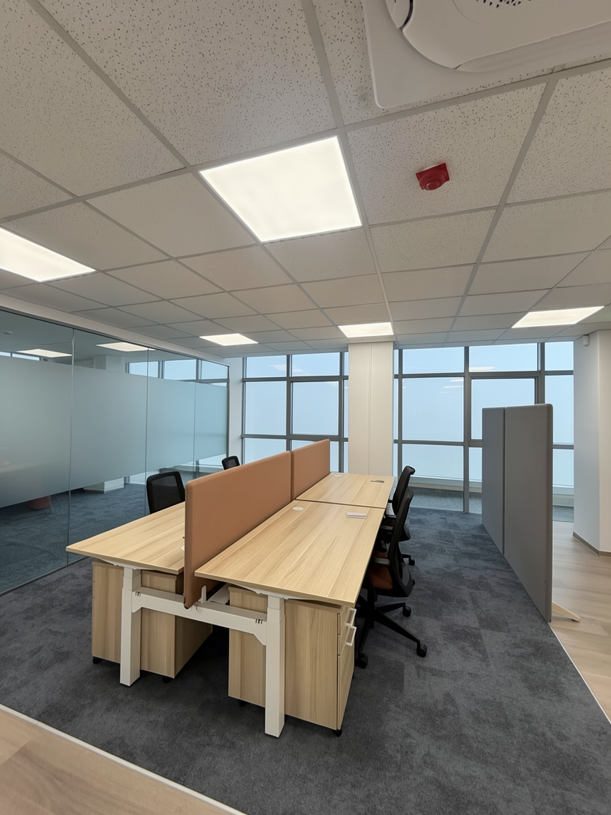 enhance this office interior to look professionally photographed and slightly more premium while preserving all existing materials flooring plank direction colors ceiling grid furniture and layout exactly as they are do not modify or reinterpret the flooring in any way only improve lighting balance depth contrast and overall realism