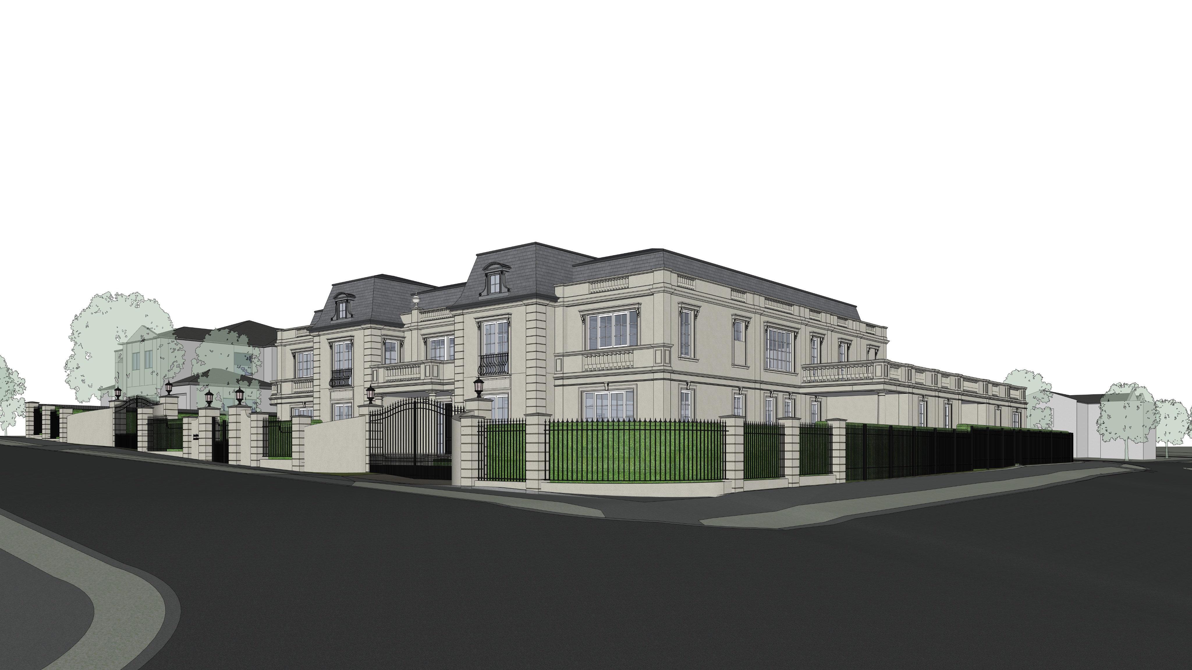 photorealistic render canon eos 5d classical home high green hedges fence dramatic lighting award winning at dusk wet slate roofing wet road pedestrian gate with two vehiecular gates on the side diffused light on the curated objects within which reflect a blend of natural textures the composition should be balanced and serene evoking a sense of high end artistry with subtle reflections of the internal light the overall image should be sharp exquisite detail from the texture of the building materials to the softness of the light glow