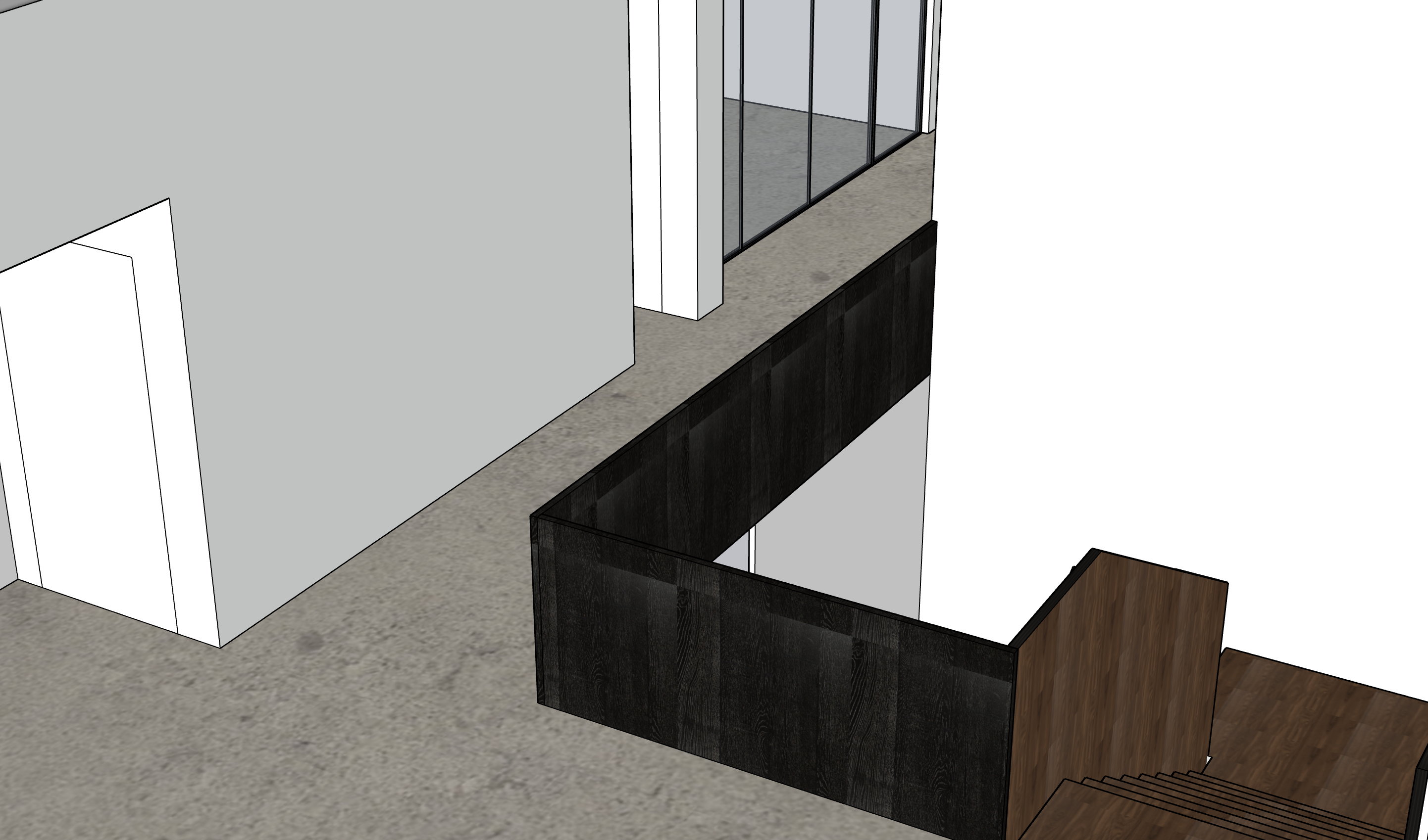 the black wood is a blackened ash finish and the brown wood is a walnut finish make the floors concrete make the glass partitions stainless steel the lighting is warm and bright the walls are white