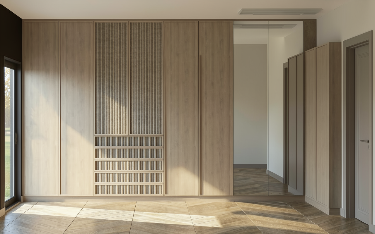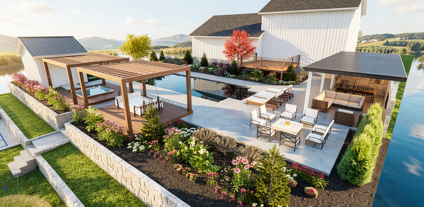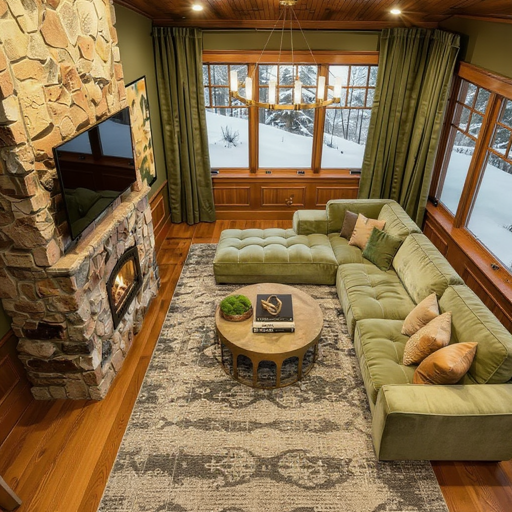 create a photorealistic view of a cosy tv room which has a stone fireplace rich timber floors and timber framed windows as reference image the furniture is a comfortable modular sofa in light olive velvet upholstery sitting on a luxurious grey patterned rug as shown in the reference image lighting is warm and emits from a pendant light and led downlights in the timber ceiling a tv sits above the fireplace on the stone wall a fire glimmers in the fireplace and a winter landscape is viewed through the windows keep all architectural features furniture proportions and lighting
