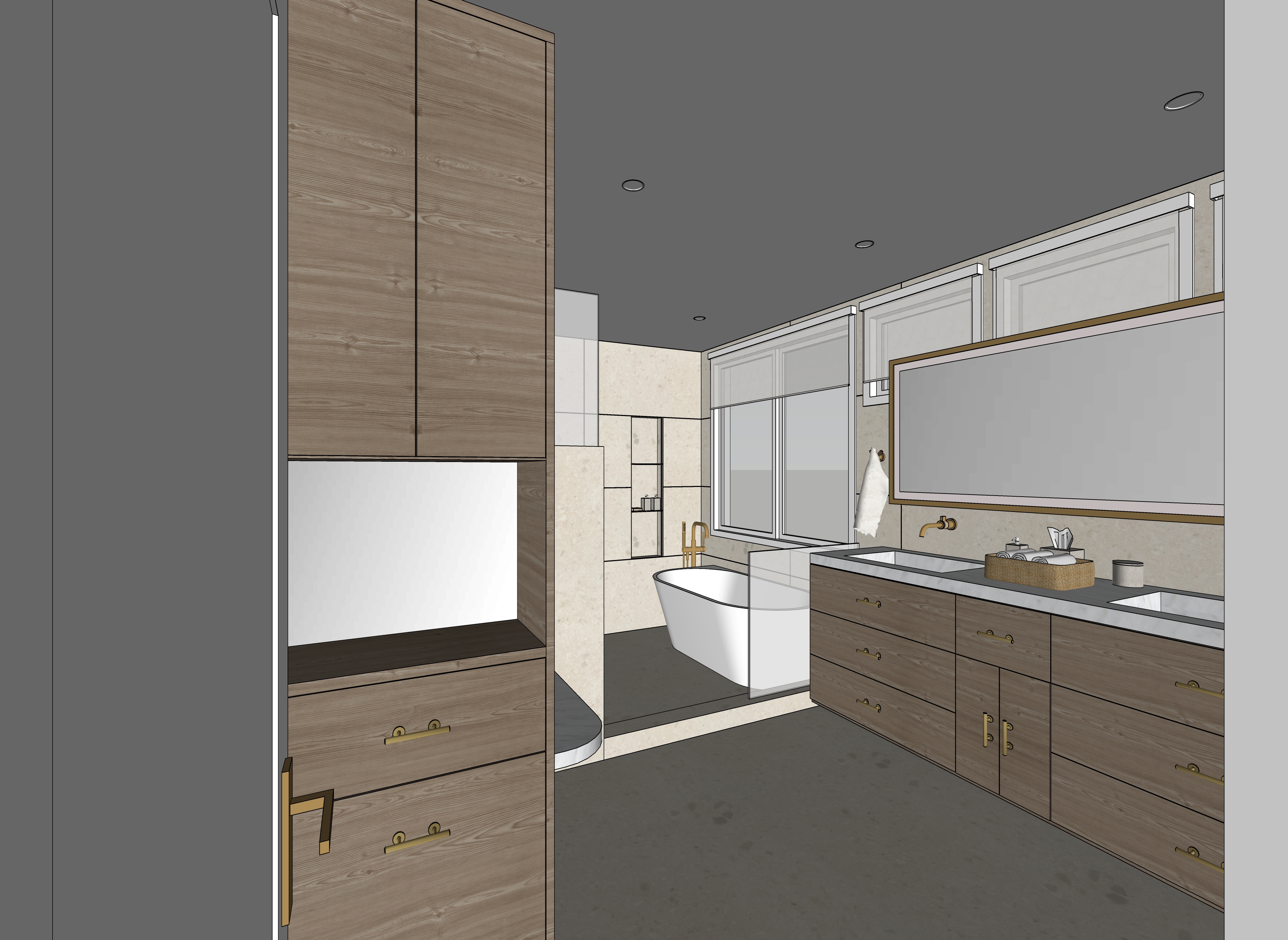 make the lighting evening time add led light on the niches shower and the tub add led lighting around the bathroom mirror add bathroom accessories and towels to the view add light coming from the recessed lights on the ceiling the walls and floor are an ivory colored porcelain tile with a matte finish where the source image shows this material the other walls and ceiling are painted white the ceiling with painted white no led lights at the bench in the shower keep the window shades in the source image do not add any led lights under the tub the vanity counter is macbeth quartz material make the wood veneer on the cabinets a white oak color