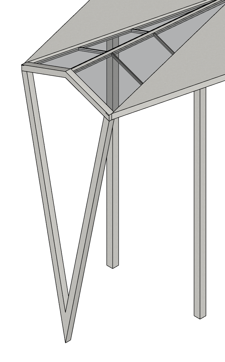 render this image as a refined architectural isometric detail keep all geometry exactly unchanged materials light speckled cast concrete for the structure clear glazing for the openings with thin aluminum steel framing clean white background emphasize crisp edge shading precise joinery at the v column meeting the roof beam subtle reflections in glass minimal shadows maintain the same material tone and style as the pavilion hero render calm precise daylight soft showing fabrication logic without changing proportions