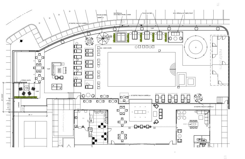 convert this floor plan into a realistic isometric 3d view of a full house show the space from an elevated angle with furniture walls and details visible render this outdoor pool plan to life use the same furniture as shows on the plan do not change the orientation of the floorplan