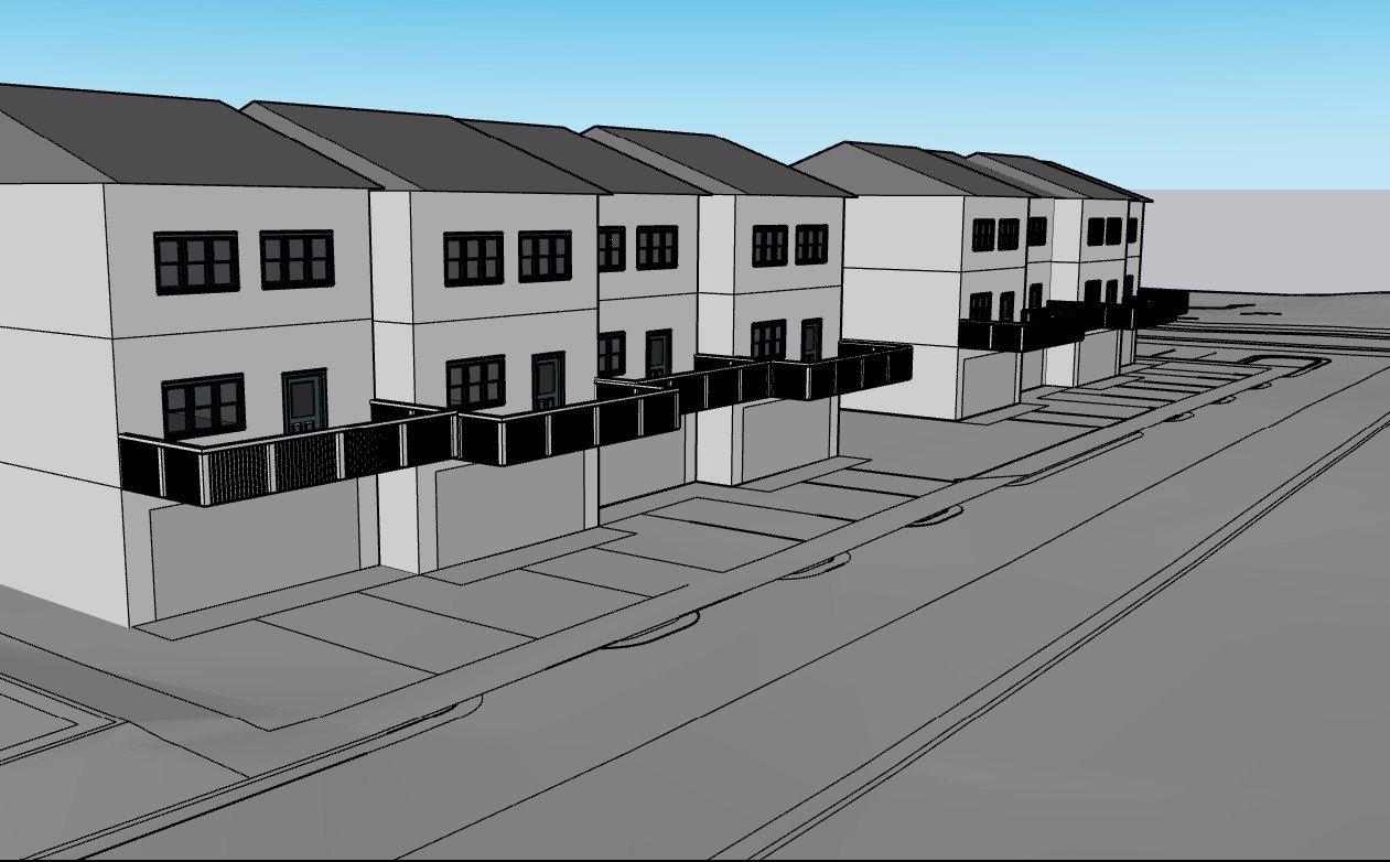 manicured lawns in front of these townhomes tallish grass each townhome needs to be wood light wash with a darker brown roof there is an outlined driveway infront of eachtownhomes garage and infront of the row of townhomes there is an outlined sidewalk and road the plantings need to be yellow green flowing trees south georgia type plants