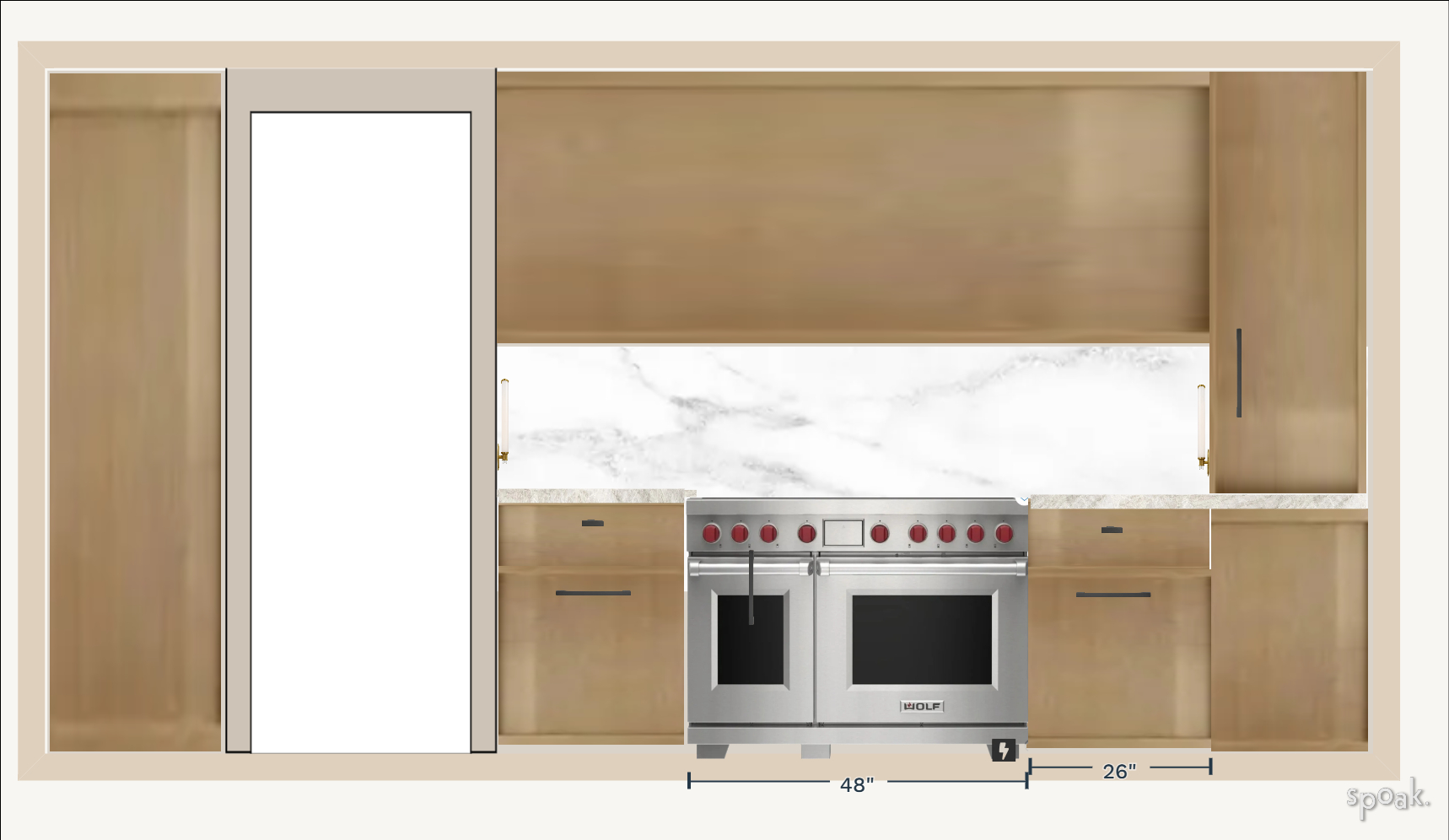 this is an elevation so the left and the bottom right cabinetry are for the side walls view create some depth on the sides above the range single wood panel is a hidden range hood there are built in sconces on either side of the range nook