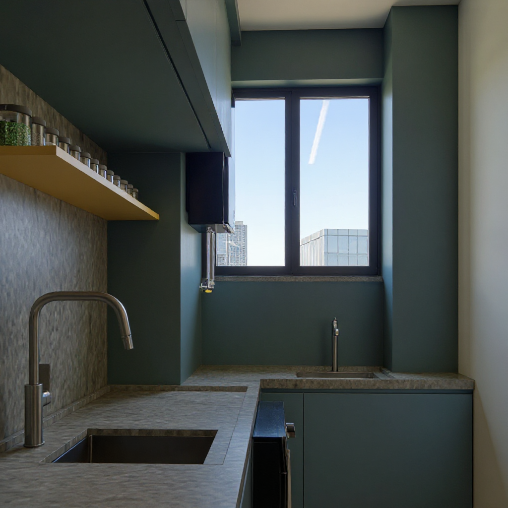 contrast overhead lighting is warm and ambient creating a cozy maintaining the minimalistic and clean design outdoor light from the right hand side window view is of luxury villa style