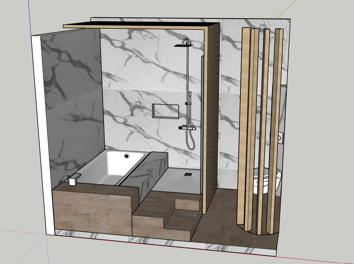 render only the geometry visible in the sketchup export do not add any walls ceilings floors backgrounds or architectural extensions leave all areas outside the original model completely empty and white do not infer missing geometry do not close the room do not complete the space do not add any surfaces or volumes outside the exact shapes present in the sketchup model reproduce the materials proportions and layout exactly as modeled bathtub steps wood slats marble walls shower fixtures niche and toilet area no reinterpretation no modification no completion of missing parts lighting must be photorealistic and professional but must not introduce any environment hdri or background the scene must remain isolated with no added architecture you may add only a few small soap bottles inside the shower niche no other d cor no props no furniture no accessories anywhere else