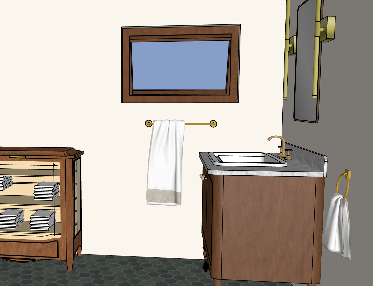 add daylight and warm lighting coming from the two light fixtures above the sink