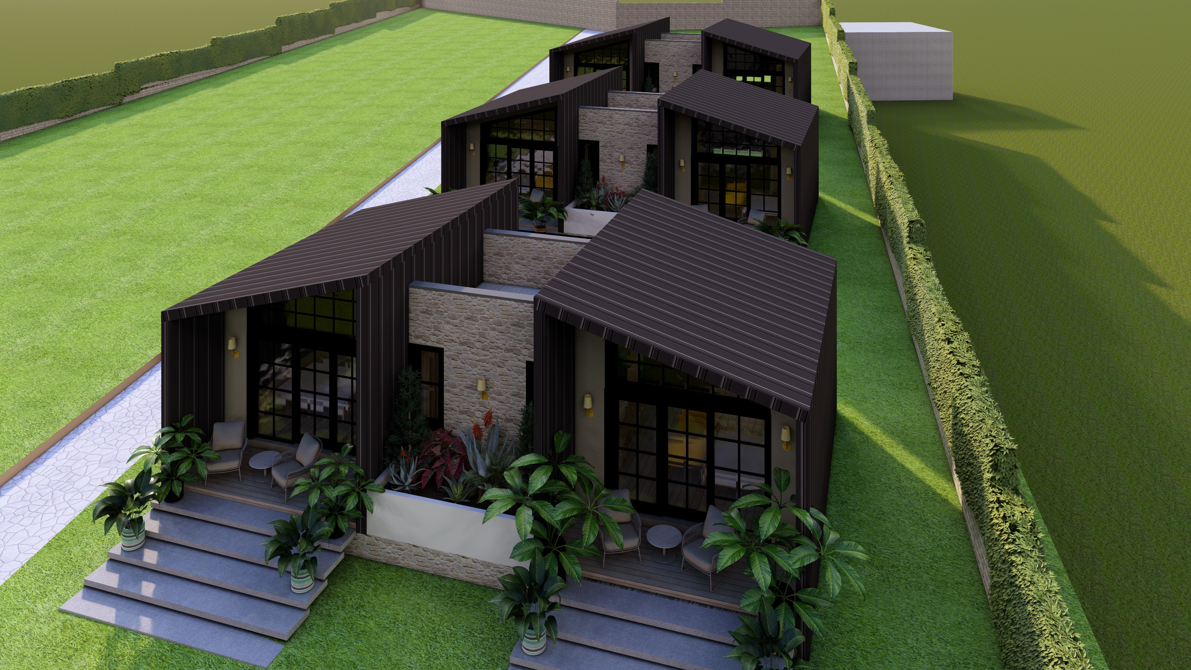 this is a model of cottages add few trees and vegetation for context add creamish interior warm lighting low brightness