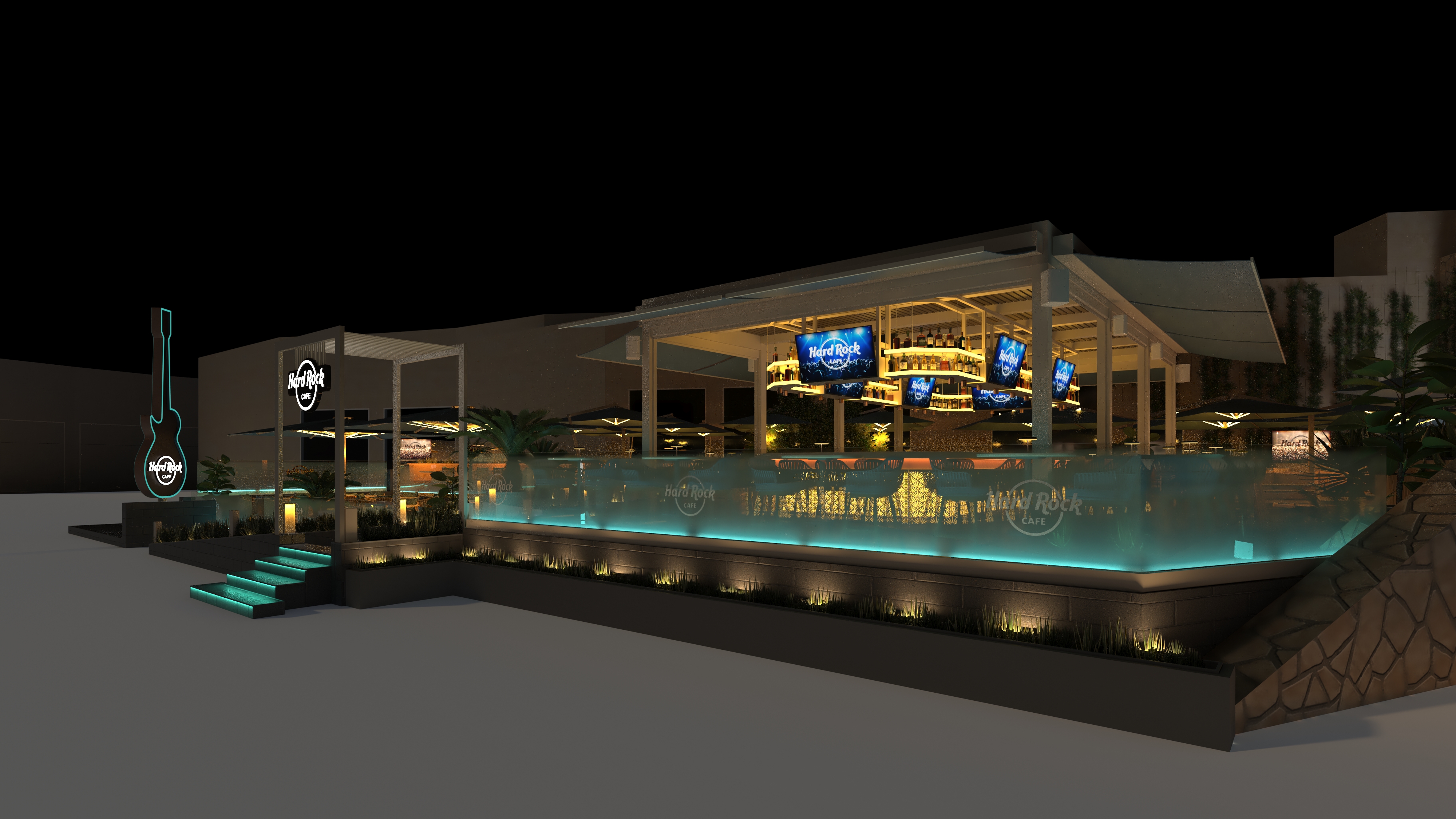 render a modern caf with a lively vibrant atmosphere at night the structure features warm beige and cream tones for the building and columns accented by glowing teal neon lights around the signage and steps the interior is warmly lit with a golden yellow glow reflecting off the curved bar shelves and highlights blue led screens add a pop of color and energy to the scene plants with dark green leaves are placed around the perimeter the surrounding night sky is deep black enhancing the illumination of the caf emphasize a chic inviting environment with a touch of elegance and modern flair
