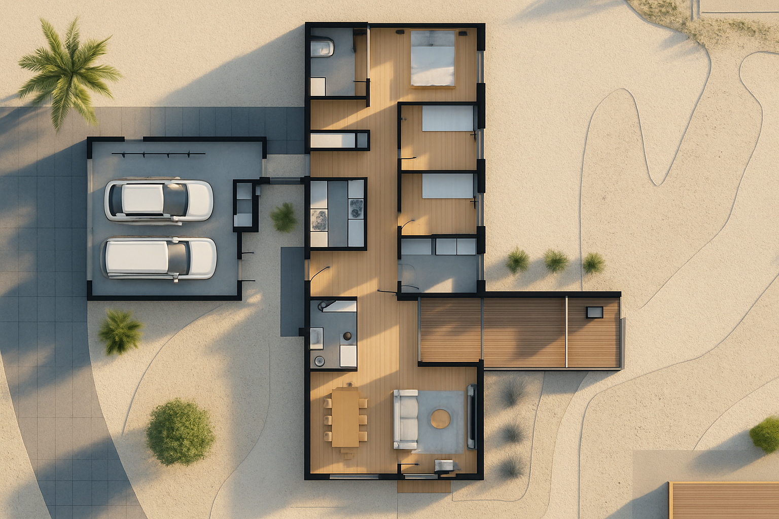 convert this floor plan into a minimalist isometric 3d view of a full house show the space from an elevated angle with furniture walls and details visible el pavimento del exteriore que rodea la casa es hormigon ciclopeo use the same furniture as shows on the plan do not change the orientation of the floorplan