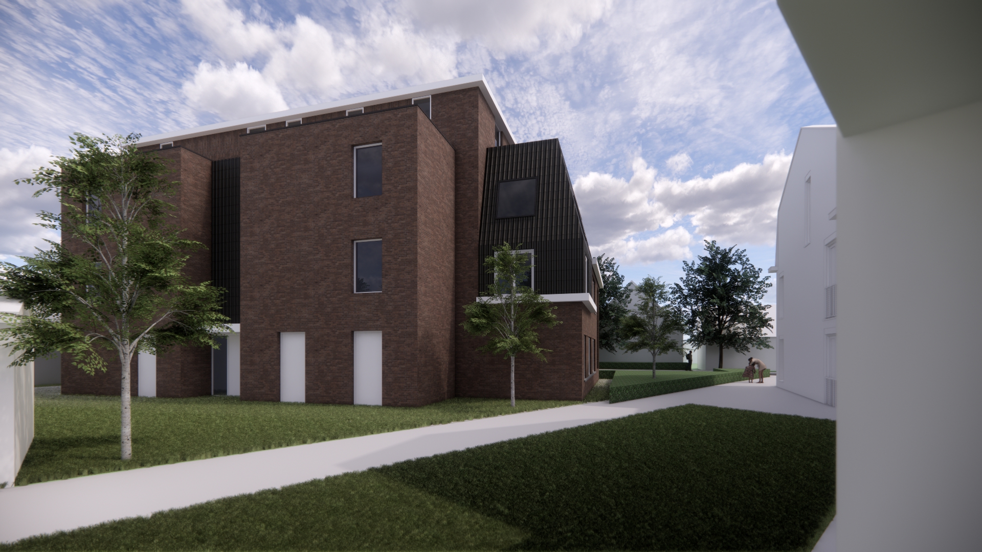 maak deze bestaande architectonische render fotorealistisch verbeter het gras en de begroeiing zodat deze natuurlijk en gevarieerd oogt met realistische texturen diepte imperfecties en subtiele kleurvariaties zoals in een echte nederlandse tuin of buitenruimte verbeter het glas door realistische reflecties en lichtbreking toe te voegen met een natuurlijke balans tussen spiegeling en inzicht naar binnen waarbij het interieur zichtbaar blijft inclusief realistische gordijnen binnenverlichting en interieurdetails maak de dakpannen realistischer als een typische jaren dertig antracietkleurige dakpan met gevelpannen en in lijn met hoe ze doorgaans in nederland worden uitgevoerd correcte verhoudingen geloofwaardige detaillering materiaalafwerking en aansluiting op het dak vervang waar mogelijk de aanwezige personen door fotorealistische mensen met natuurlijke houdingen realistische schaduwen correcte schaal en geloofwaardige kleding passend bij de omgeving zonder de compositie te verstoren behoud exact de bestaande verhoudingen afmetingen camerahoek en compositie behoud de huidige materialen en kleuren maar verfijn ze subtiel zodat ze natuurgetrouwer ogen realistische ruwheid reflectie veroudering en detailniveau verhoog de algehele lichtbalans schaduwwerking en materiaaldefinitie voor een hoogwaardige architectuurvisualisatie met een fotografische uitstraling upscale de afbeelding naar 4k resolutie met scherpe details en zonder artefacten stijl fotorealistisch high end architectural visualization natural lighting real world materials dutch residential context