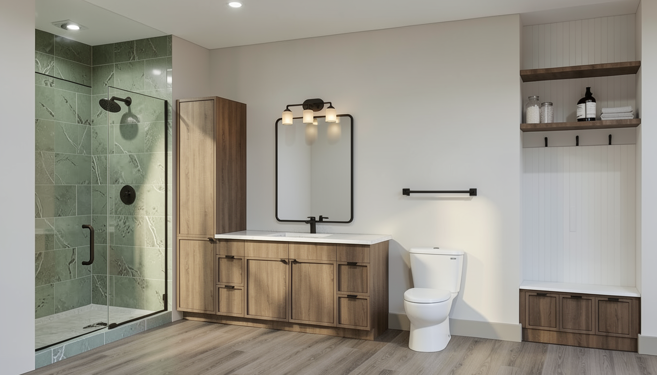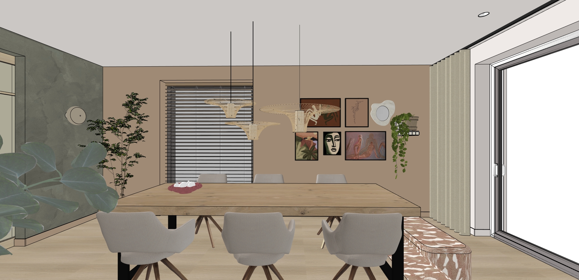 bright render hanging lights on garden view through windows chair frame made of matt copper