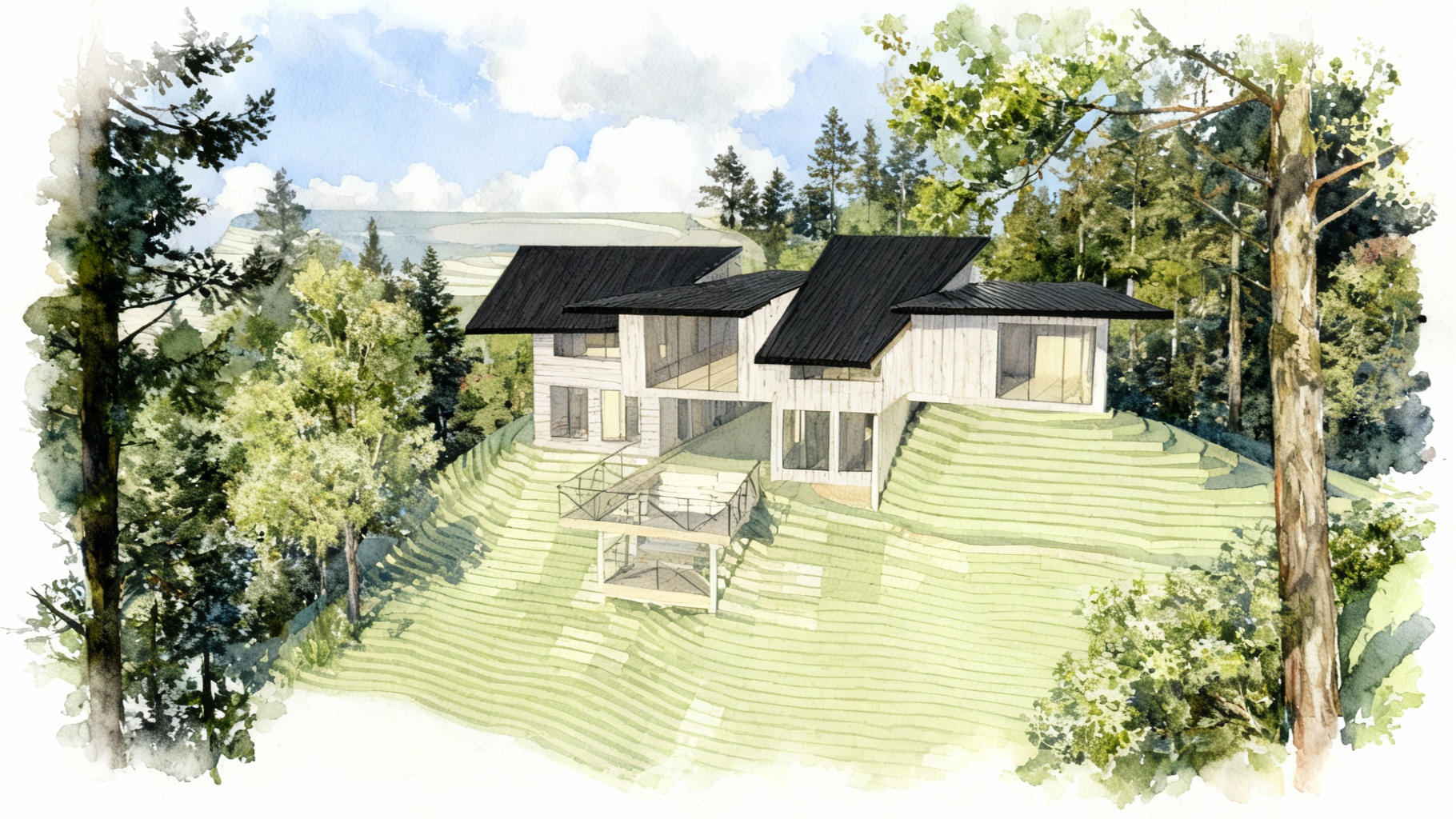 change background to forest with a blue sky and clouds add a lot of trees infront of the building on the right side make it look like its watercolor have the border fade out to white make the grey look like pavement