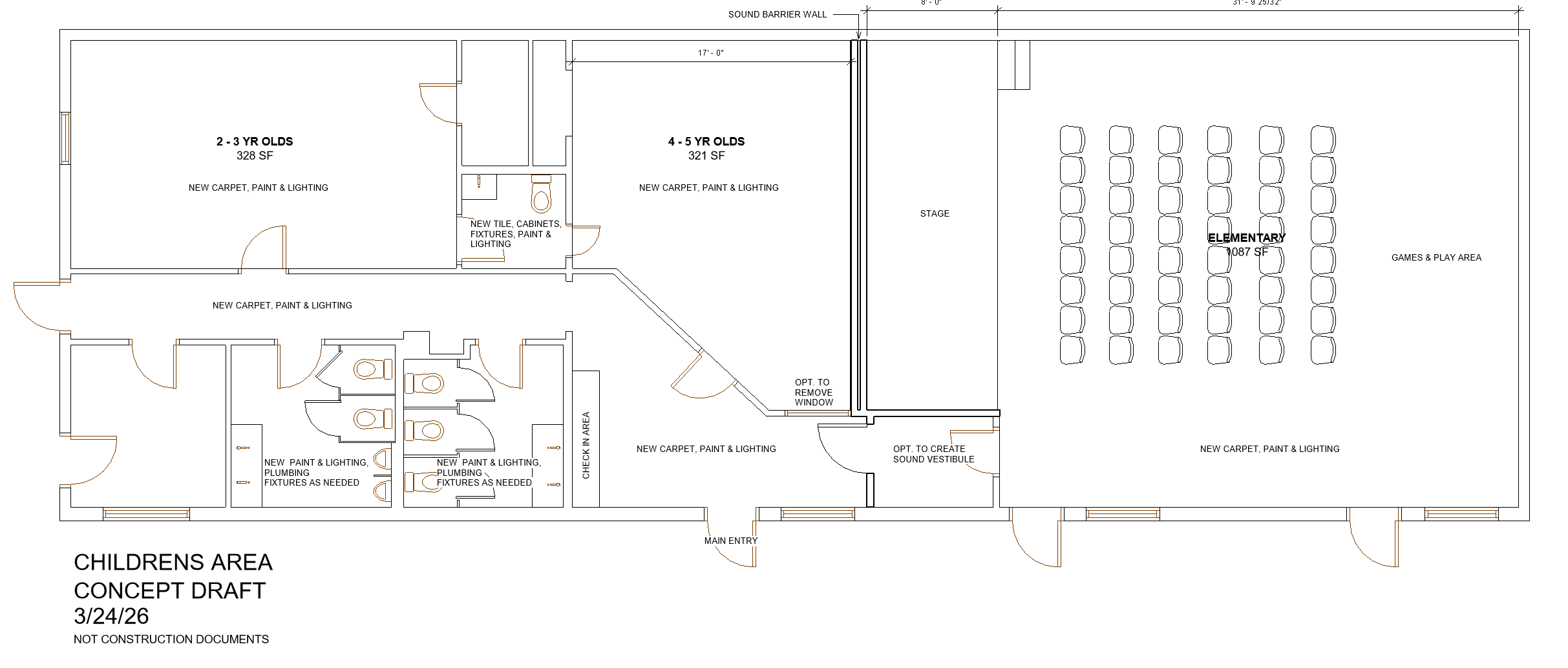 convert this floor plan into a realistic isometric 3d view of a full house show the space from an elevated angle with furniture walls and details visible this is a modern kids space with classrooms add gray carpet tiles with some colorful preschool furniture but minimal amount use the same furniture as shows on the plan do not change the orientation of the floorplan