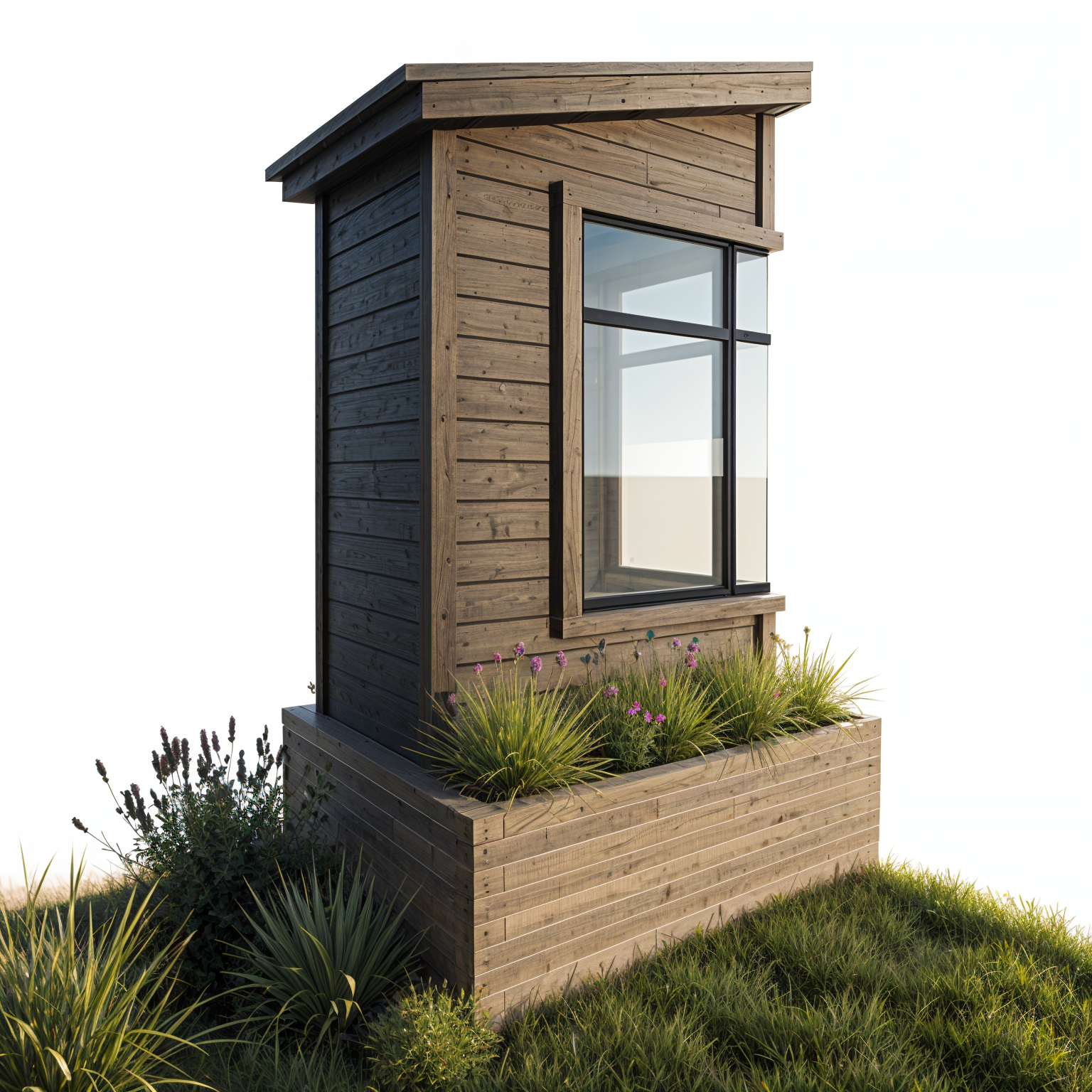 make image photorealistic maintain black siding and trim dark bronze window frame and earth toned brick planter replace plants with realistic plants and render glass reflection in a more realistic manner