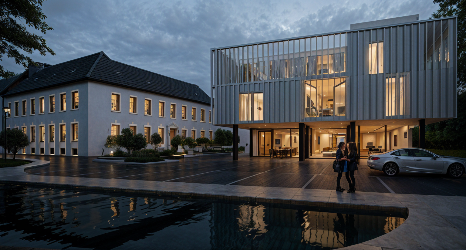 a modern architectural scene at twilight featuring a blend of classic and contemporary building designs the left building is an elegant white colonial structure with soft amber lighting emanating from its windows creating a warm and inviting atmosphere the roof is deep brown complementing the soft twilight sky in shades of calming blue gray on the right a sleek modern building with vertical slats painted in a sophisticated charcoal gray glows with warm golden lights through expansive glass windows medical equipment inside check in desk on the ground floor the white wet pavement reflects the buildings lights enhancing the serene ambiance a smooth reflective pond in the foreground mirrors the scene edged by delicate lily pads exuding tranquility and harmony sparse trees add a touch of nature and softness to the scene completing the peaceful elegant atmosphere bright ligts coming from inside