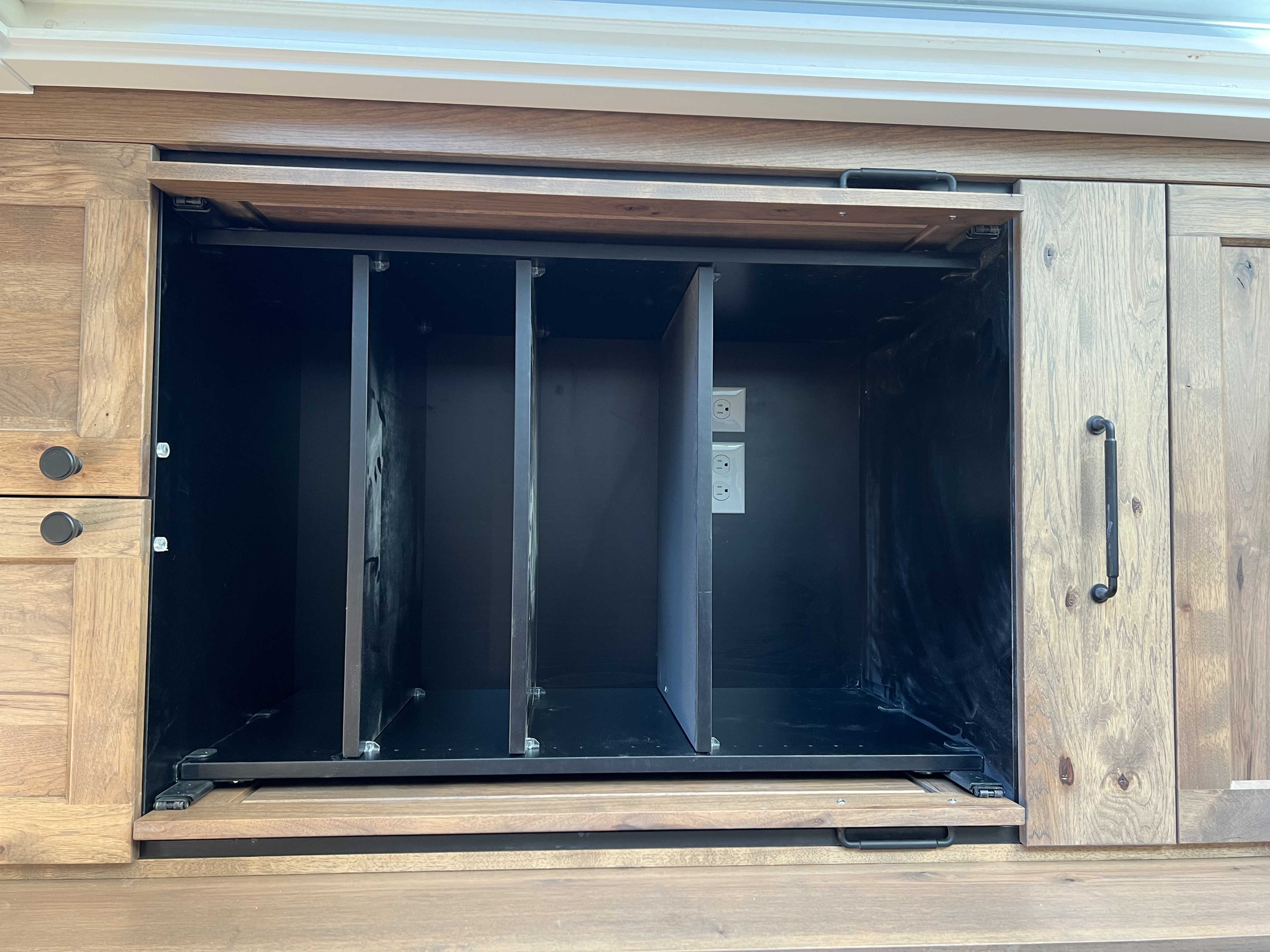 do not change the cabinets in any way preserve the exact cabinet colors materials finishes dimensions door and drawer styles hardware spacing alignment and all geometry exactly as shown do not alter the countertop shape backsplash appliances flooring lighting fixtures or wall structure only remove the construction materials clutter and mess from the scene clean the room and make it look finished and staged add a few simple tasteful home accessories appropriate for the style of the space but do not add or remove any furniture windows or architectural elements maintain the original lighting direction and realism enhance clarity and polish the photo while keeping the cabinetry and room design completely unchanged do not alter the lighting to keep the cabinet colors as they are in the image do not change the cabinetry at all or add any accessories stage the inside of the cabinet for a coffee station filled with mugs filters and coffee accessories add a nice view out the door do not add lights or anything else to change the layout of the cabinet at all