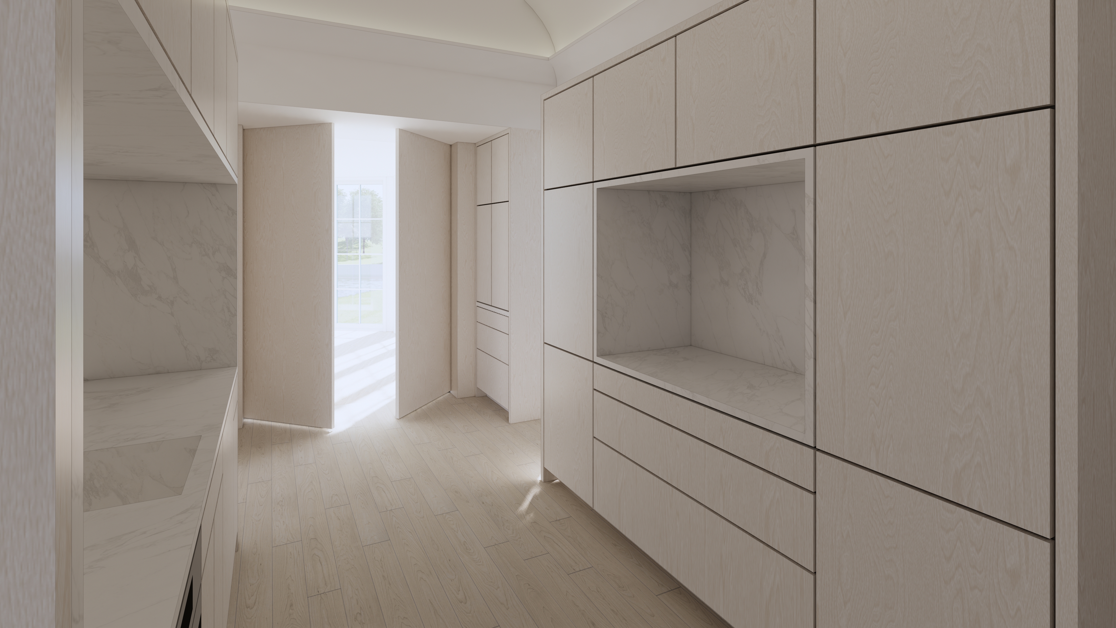 make this look like a high end butler s pantry with white oak natural stain on the cabinets and venetian plaster walls and ceiling that are smooth and do not look like they have scratch marks add high end decor to the space as one would find in a highly stylized butler s pantry but so that the owner feels like it will be a lovely space to be in the room beyond is the gallery show the same wood floors in there make sure the ceiling and walls are white venetian plaster