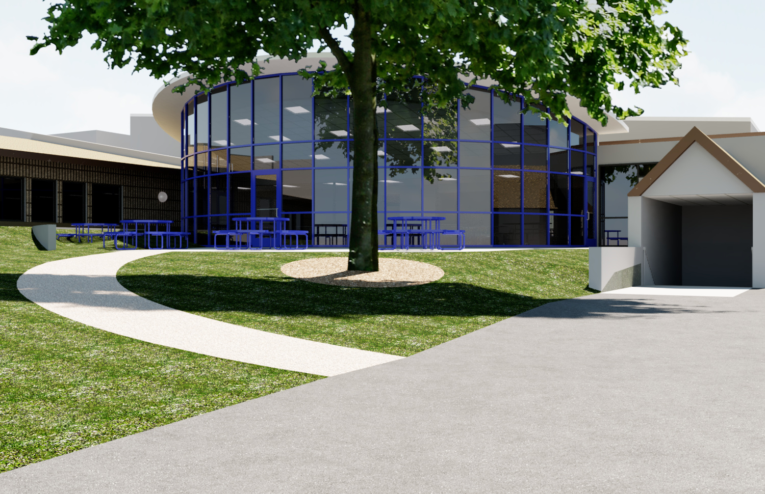 add students sitting at the blue picnic tables add decorative landscaping around base of tree add decorative landscaping along edge of curved sidewalk darken pavement add bright blue sky with a few fluffy clouds add students inside glass walled building increase brightness and visibility inside building architecture
