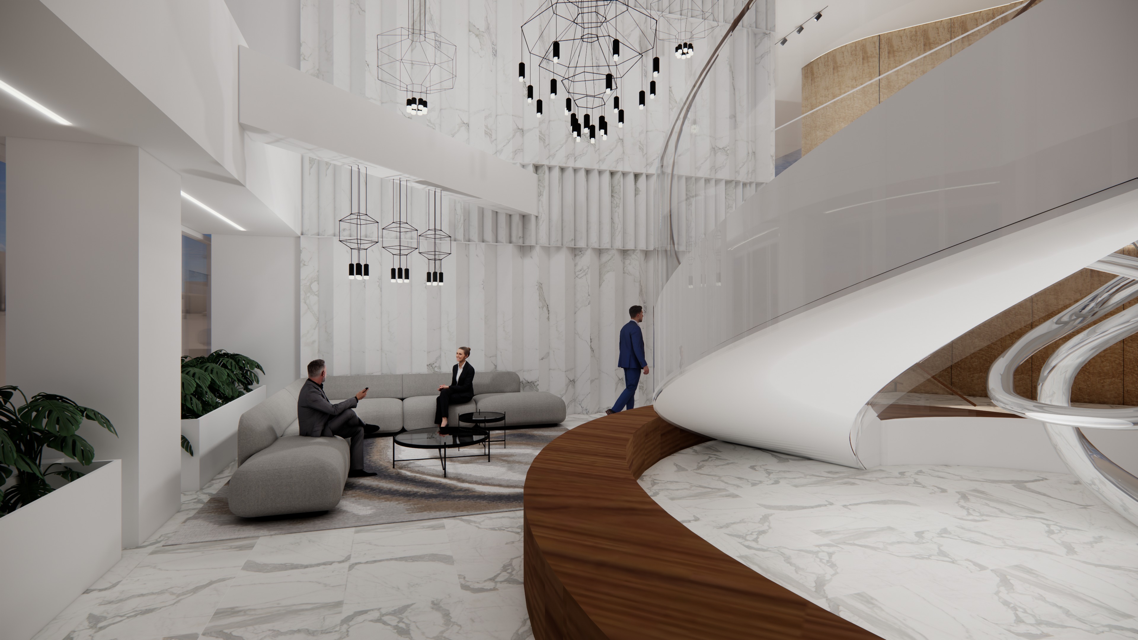 transform the provided interior image into a high end photorealistic render with soft glowing highlights and relaxed upscale energy while keeping everything exactly the same same proportions same seating same ceiling same wall finishes same materials and same spatial configuration do not move or alter any objects geometry textures colors or furniture positions all objects throughout must remain exactly in the same locations and proportions on the left windows only provide nyc building views from 44th floor in the middle of midtown new york city in the morning 10am light do not change people