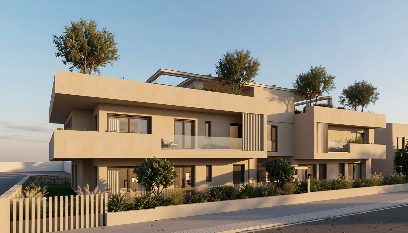 photorealistic interior lobby at senior living facility show old people sitting and walking through space show women behind front desk working at computer show wood wall paneling feature wall behind front desk with artwork mounted to wall scene outside window to be of the beach far off in the distance