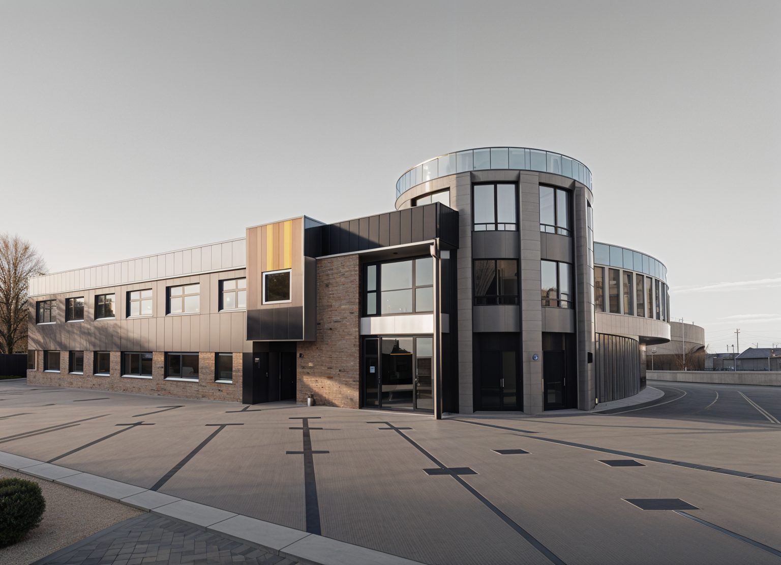 contemporary exterior shot industrial style brick and beige and black metal cladding architecture