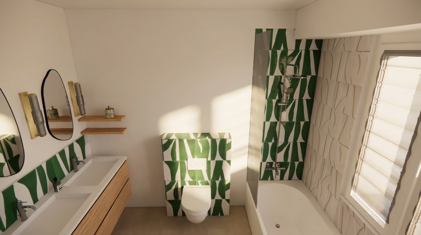 make this person ultrarealistic define her face and clothes is a woman behind a computer not a man she is a recepcionist man add a european man in a suit sitting only on the fully visible orange pouf in the foreground center left he must be clearly seated on the pouf with his weight resting on it not touching the stairs not sitting on any other surface natural posture looking at his phone table add a glass water bottle and a drinking glass on the table important constraints do not modify architecture furniture materials lighting or composition do not move elements do not change camera ultra realistic result natural skin correct anatomy proper shadows no ai artifacts no plastic look