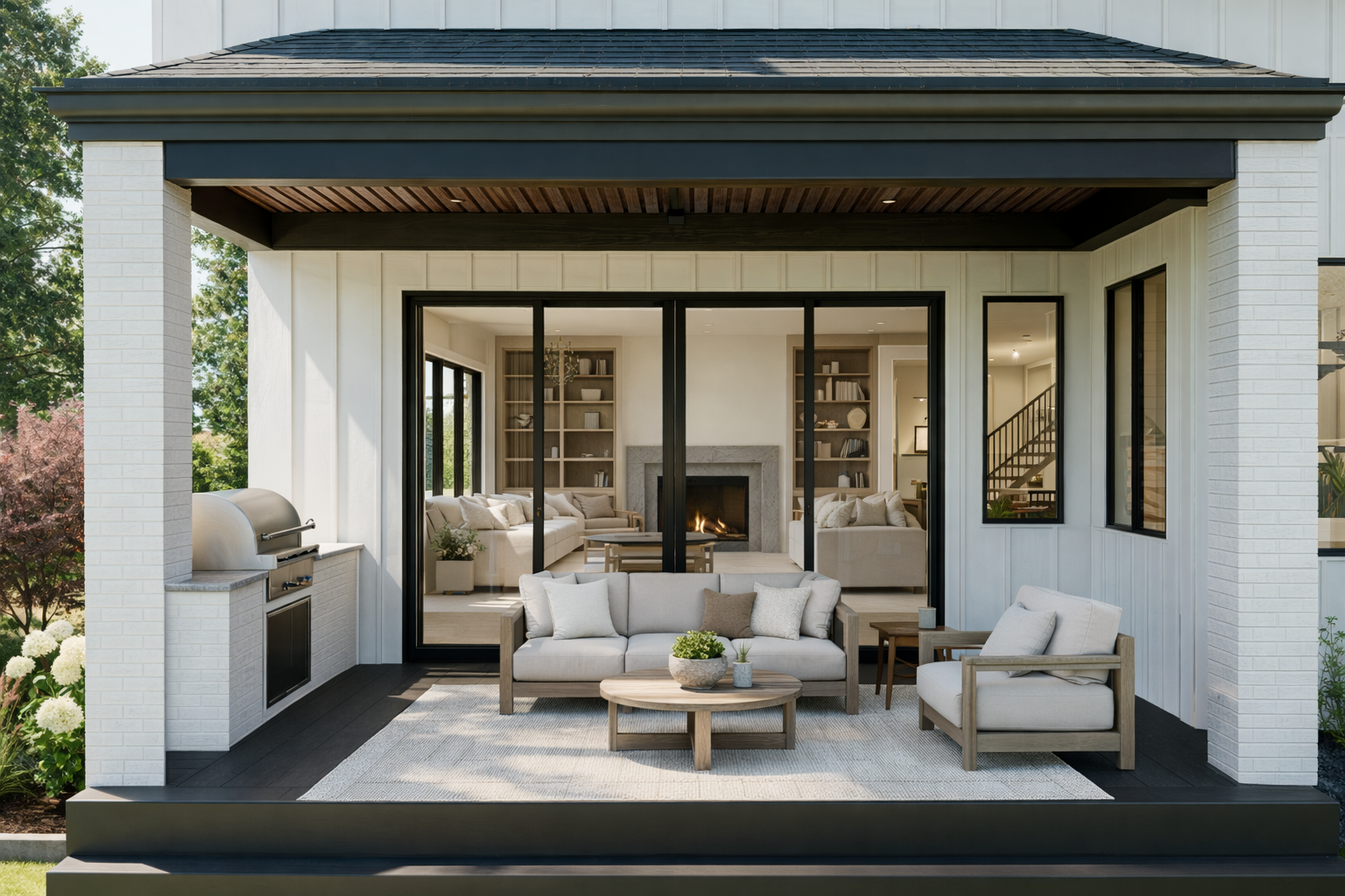 convert this architectural rendering into a highly realistic editorial style luxury real estate photograph suitable for marketing and listing imagery maintain the exact architecture layout geometry window placement and proportions exactly as modeled do not redesign restyle or modify the architecture in any way do not move walls windows fireplaces cabinetry or structural elements enhance realism only through natural lighting accurate material texture subtle reflections and soft shadow depth the image should feel like a professionally photographed architectural digest style interior used for luxury real estate marketing natural light should be softly entering through the windows in an editorial photography style creating gentle highlights natural interior bounce light and subtle shadow depth similar to high end architectural photography the final image should appear highly realistic refined and editorial similar to a luxury architectural digest feature or professionally photographed high end listing do not alter architecture layout geometry or materials only enhance realism and staging add a realism prompt that emphasizes photo realistic image with soft natural light coming from the left side door here is the added realism section you can append to your prompt it keeps everything you already wrote but pushes the image toward photorealistic real estate photography with the light specifically coming from the left side door