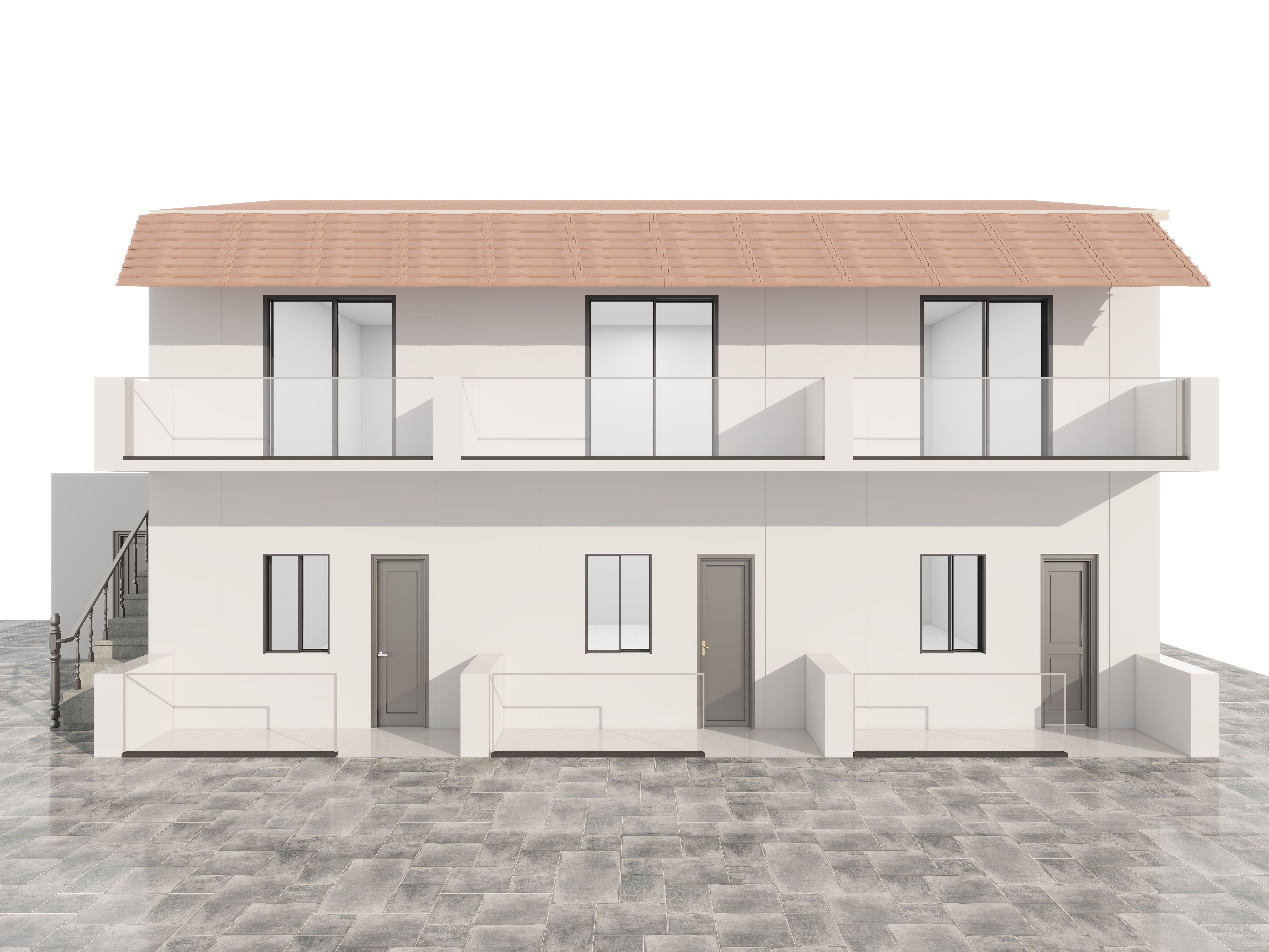 an wonderful airbnb rental building in zakynthos island greece sunny day with 2 3 trees around grey beige thermal facade black windows and doors